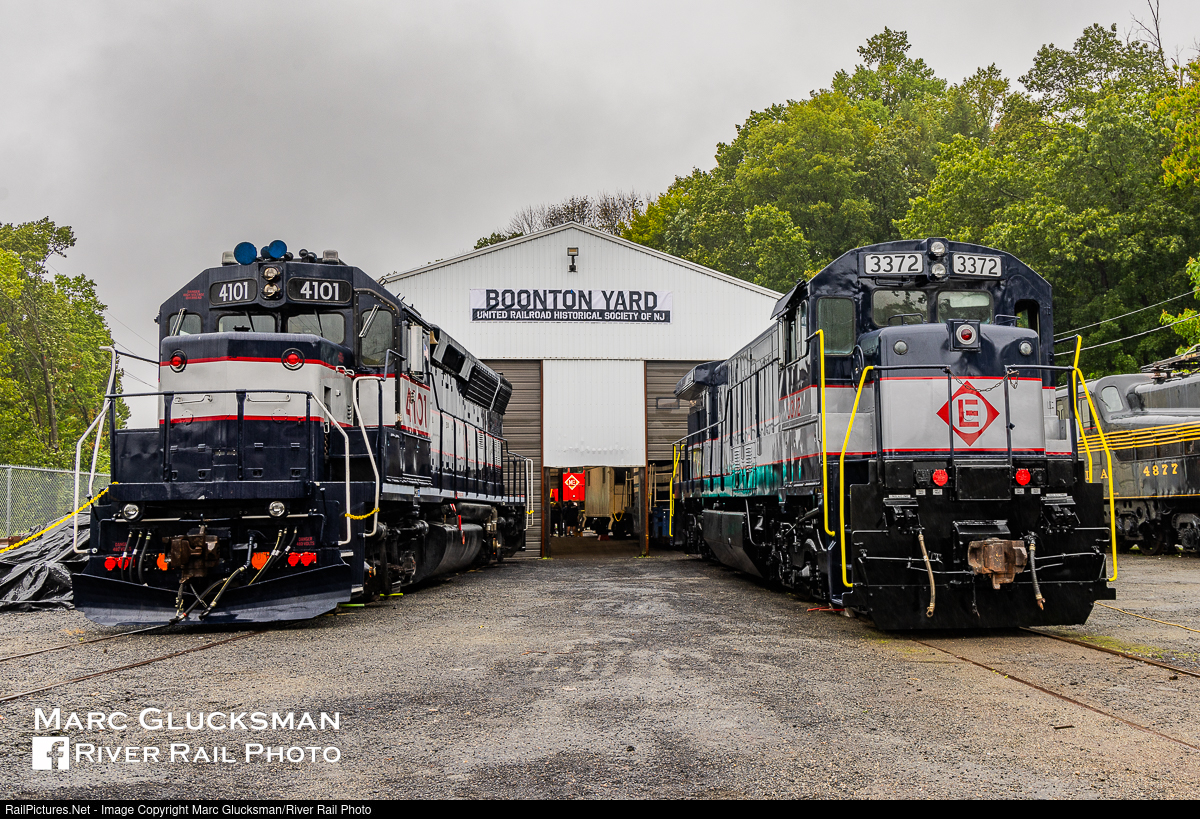 Reunited For The First Time. GE built U34CH 3372 was purchased by the New Jersey Department of Transportation for Erie Lackawanna to use in commuter service with Pullman-Standard built Comet cars on its diesel lines. Chronically unwashed in that era, its colorful appearance is jarring to those that saw them in service. Ultimately inherited by NJ Transit, it was retired in 1994 and donated to the United Railroad Historical Society of NJ. On September 24, 2023, it sits at the "Museum For A Day" event at Boonton, New Jersey on display next to NJTR GP40PH-2 4101, a heritage unit on loan from NJT for the day, in matching 1970s era NJDOT paint. The two are seeing each other for the first time since being repainted in the modern era, but perhaps even more poignant, they likely never spent much time together during their service careers except perhaps in the shop as the GE was a Hoboken Division based unit and the geep would have been in Newark Division service at that time.