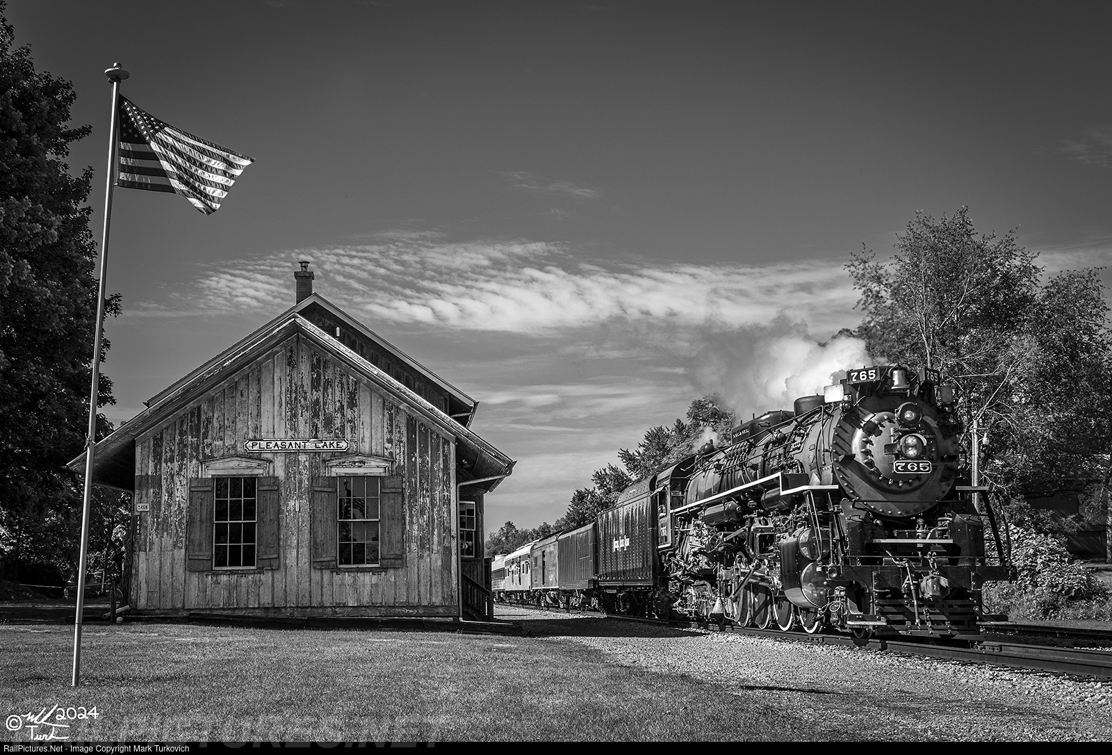 Nickel Plate Road 765 rolls past the Pleasant Lake Depot with its passenger train on a sunny June morning.