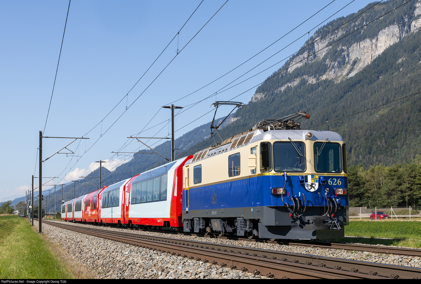 | The Rhaetian Railway's Ge 4/4 II # 626 “Malans” locomotive was given a new livery in cobalt blue and ivory to match the “Alpine Classic Pullman Express” (ACPE) parlor cars, at the suggestion of the Friends of the Saloon Cars of the RhB Association. The ceremonial rollout took place in Landquart on September 17. The design of the locomotive was made by graphique artist Michaela Hardmeier in cooperation with the RhB. Name and coat of arms of Malans is now small on the grey frame visible. The locomotive will be given the name of Alby Glatt in 2025, "Mister Pullman" and founder of the saloon cars of the RhB association. The locomotive is now in normal use in front of freight trains or the Glacier Express. On this day she pulled the PE 903 GLACIER EXPRESS from St.Moritz over the Albula line to Chur, seen between Felsberg and Chur. The cars were then pulled by another Ge 4/4 II to Disentis, and further with a HGe 4/4 II of the Matterhorn-Gotthard-Bahn via Andermatt-Brig to Zermatt. |