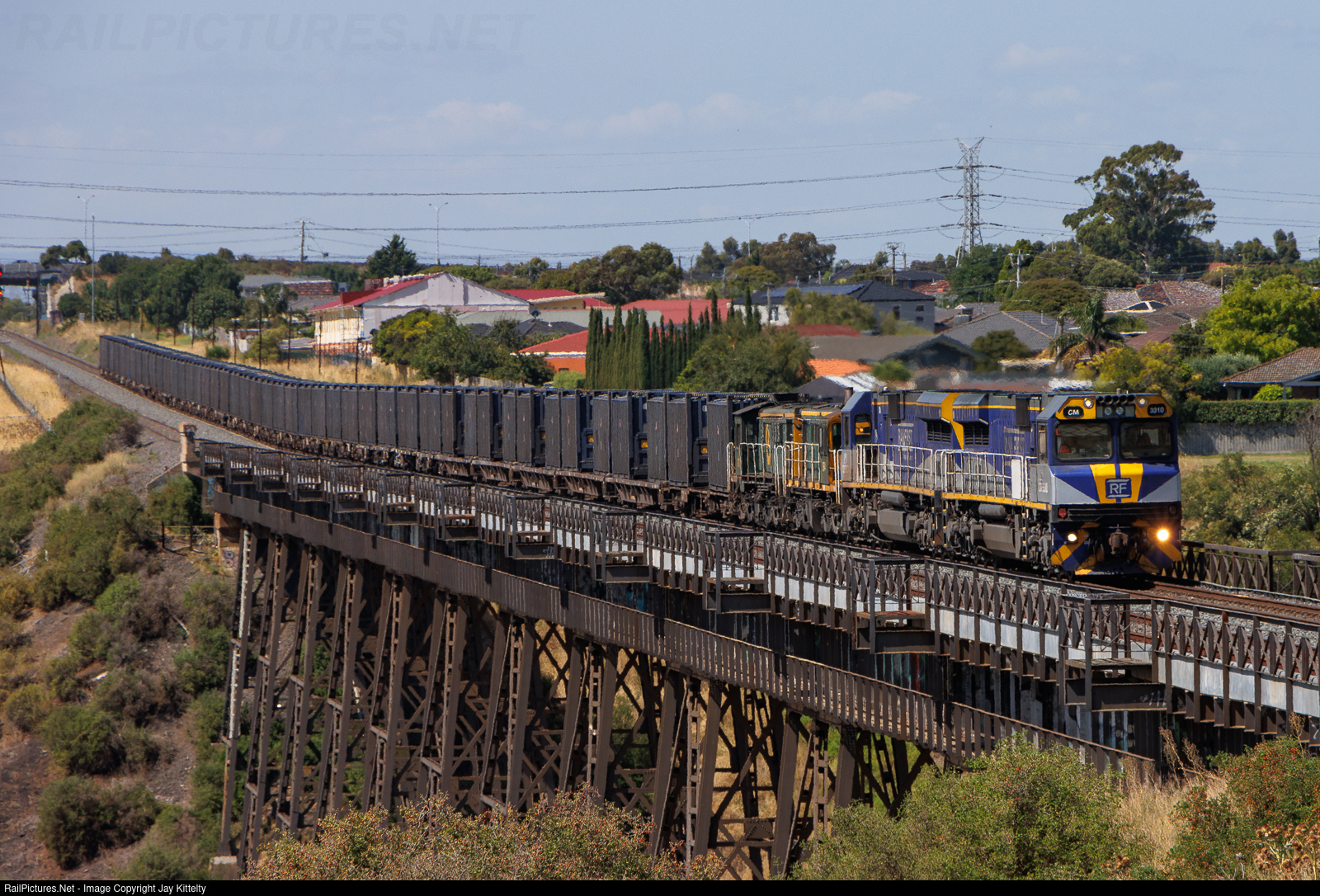 Qube's box grain train 6CK1 is seen crossing the Maribyrnong River Viaduct on its way to Melbourne where the locos will be refuelled in preparation for their trip to Victoria's west. The train was made up of Railfirst's CM3310, CM3304, and Qube's vintage Alco locos 864 & 872.