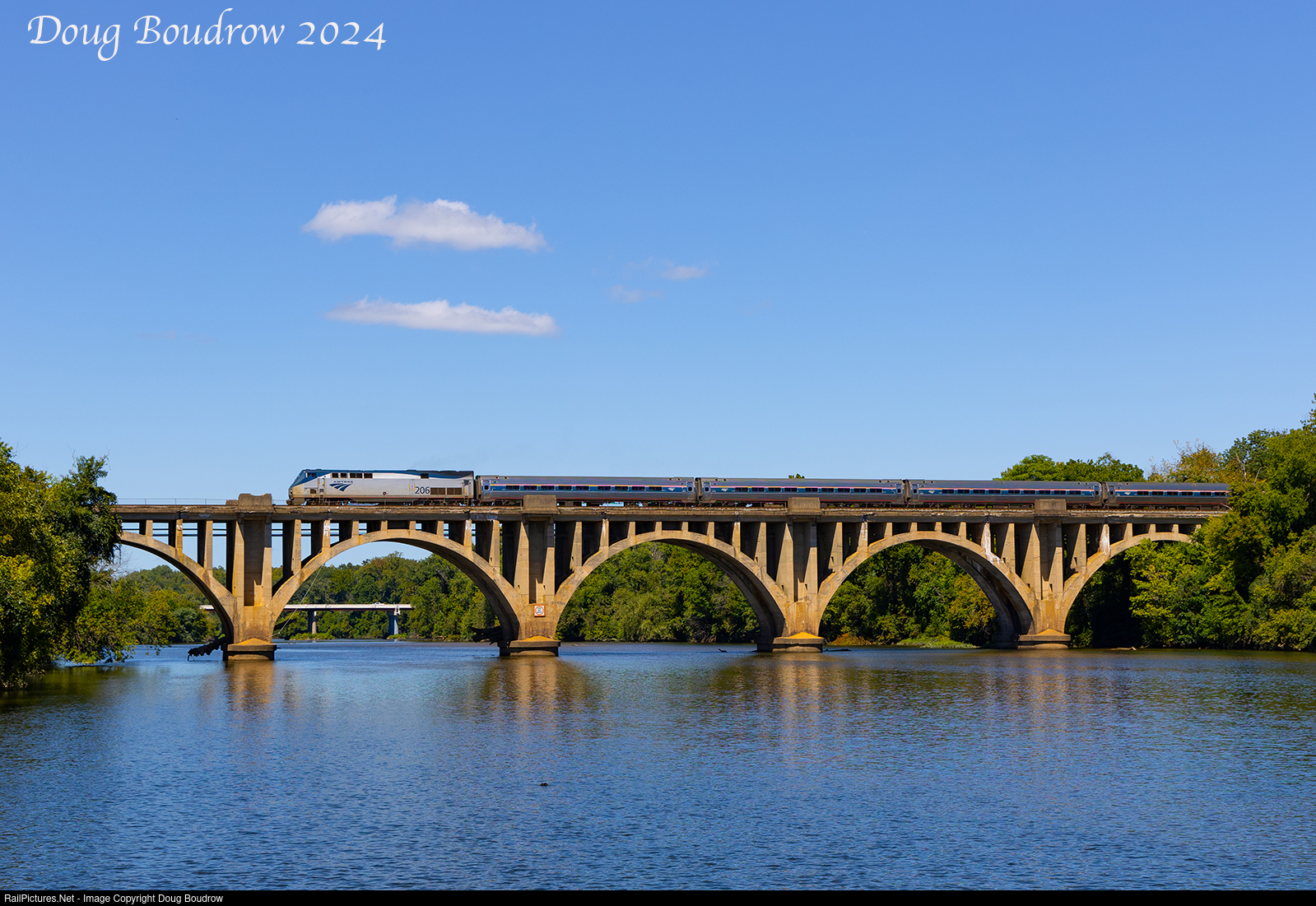 Amtrak Regional 153 (New York, NY to Norfolk, VA) is seen crossing the Rappahannock River in Fredericksburg.