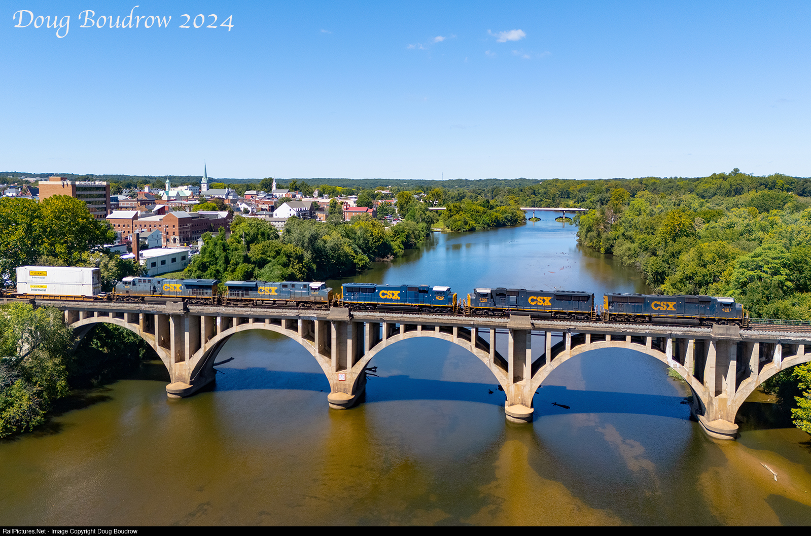 CSX manifest freight M422 (Rocky Mount, NC to Selkirk, NY) is seen crossing the Rappahannock River in Fredericksburg.
