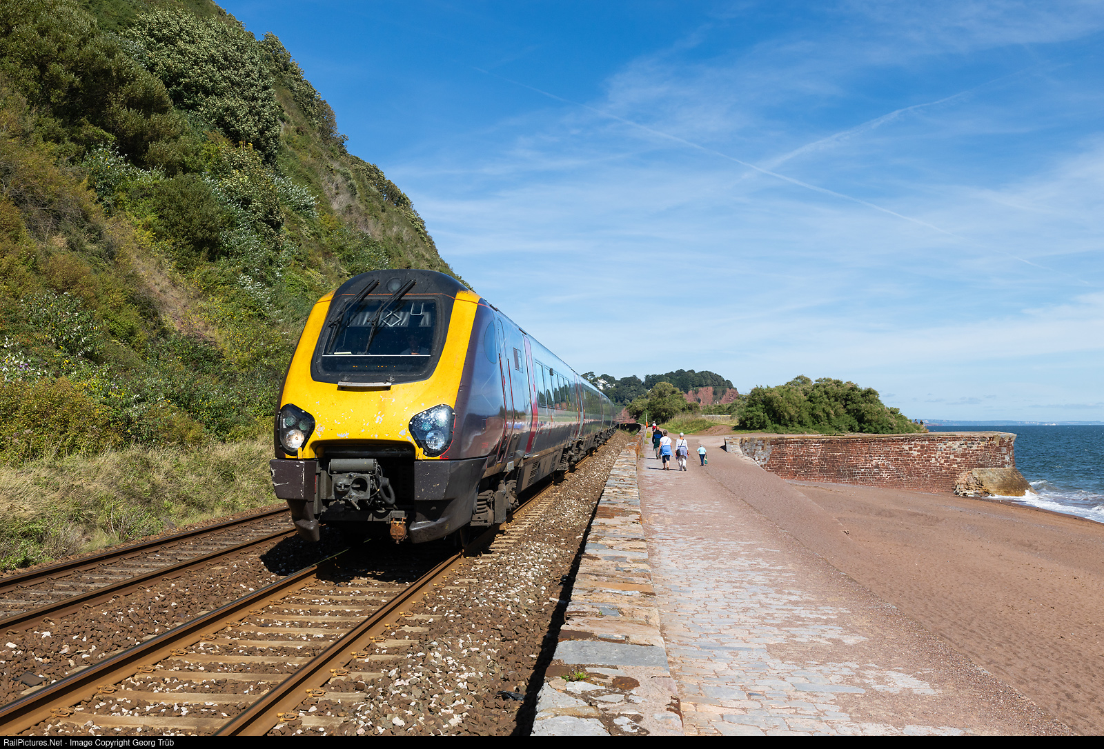 | About 55 minutes late, the "Super Voyager" Class 221 of the Cross Country is running along the sea wall between Dawlish and Teignmouth, as train 1V48 from Newcastle to Plymouth. |