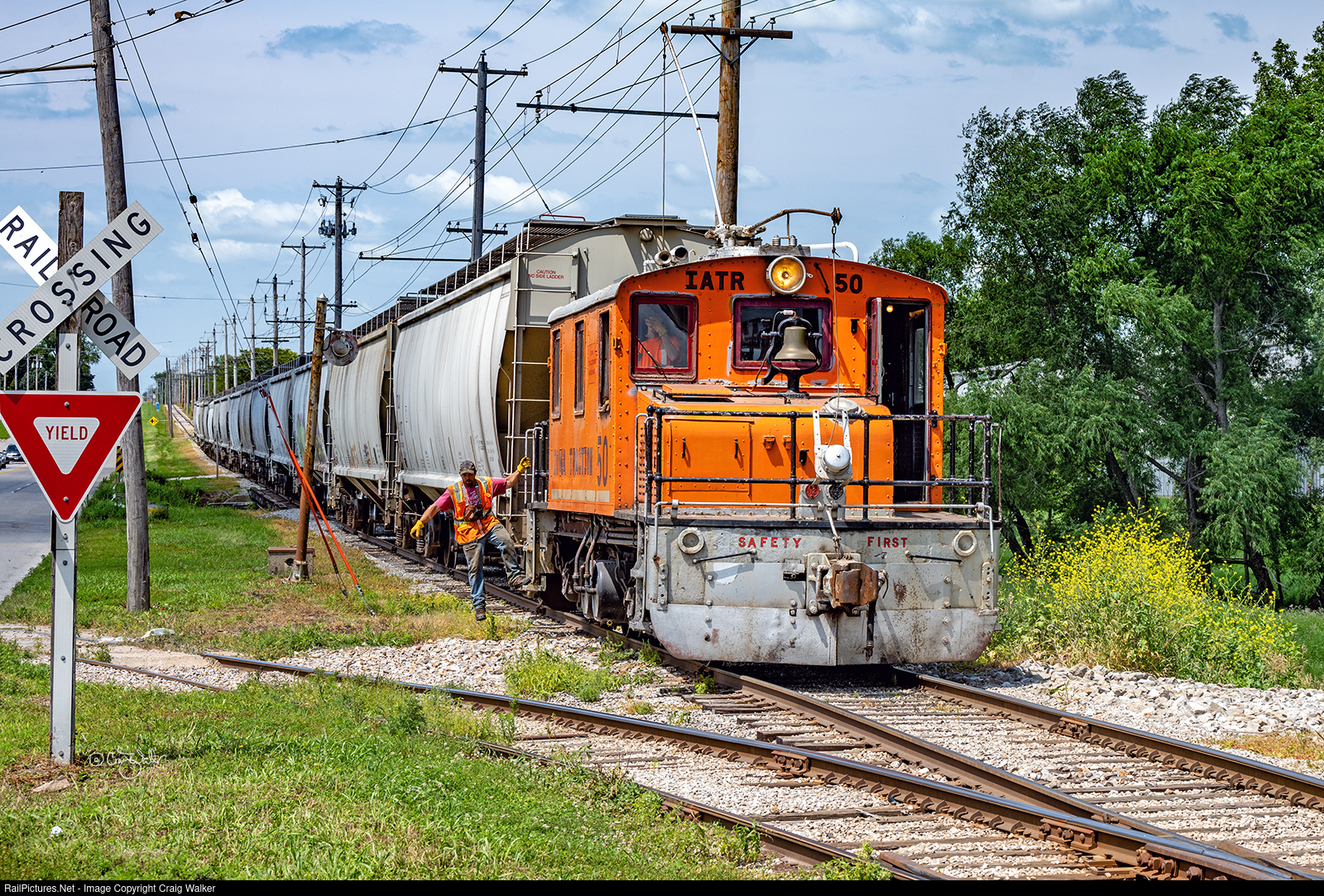 Iowa Traction Railway 50-Ton Steeplecab 50, built in October 1920 by Baldwin-Westinghouse, has just picked up a cut of grain hoppers for the AGP elevator across 19th Street SW. IATR 50 was built by Baldwin-Westinghouse in October 1920 as Washington & Old Dominion 50. In 1948 it became Cedar Rapids & Iowa City (as CRIC 58), and in 1956 was sold to Kansas City’s Kaw Valley & Western (KVW 507). In 1963 it was sold again, this time to Iowa Terminal (ITR 50) and then Iowa Traction 50 in 1987. The diminutive locomotive is dwarfed by today's large covered hoppers which, after the switch is thrown and the raised trolley poles are reversed, will be shoved into the AGP grain facility across the street.