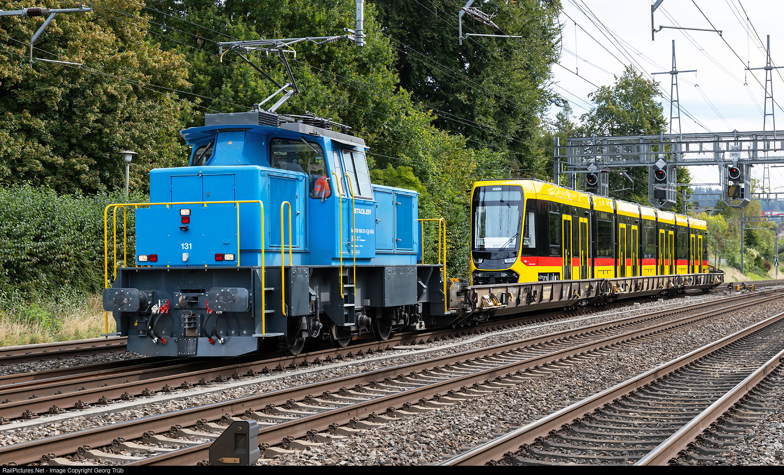 | Eea 936 # 131 of StadlerRail pulls the transfer train 69236 from Altenrhein via Romanshorn VL-Winterthur-Kloten-Regensdorf-Bözberg to Basel freight yard, between Oberwinterthur and Winterthur. The load on 3 lowfloor "Rolling Highway" cars is a new 1 meter gauge "TINA" streetcar Be 8/10 # 4210 for the Baselland Transport (BLT). |
