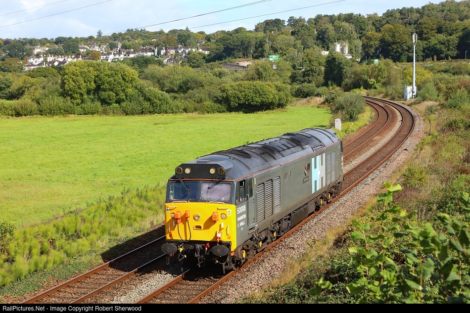 | 50008 passes Langford Bridge working 0V50 08:40 Worcester Shrub Hill to Bodmin Exchange Siding on Thursday 26th September 2024 The 50 was heading to the Bodmin and Wenford Railway for that weekends diesel gala |