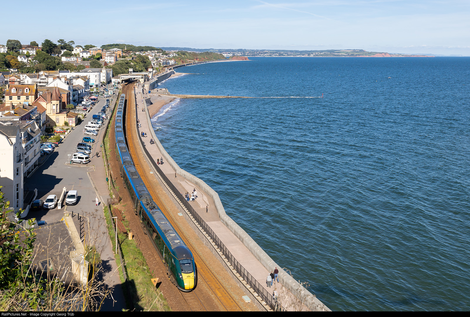 Hitachi Rail built bi-mode diesel/electro highspeed train of the class 802 of the Great Western Railway is runing along the sea wall between Dawlish and Dawlish Warren, as 1A89 from Paignton to London Paddington. Since the severe storm damage in 2014, when the line was completely closed for weeks, an £80 million project to upgrade the section was completed last year. In this part, the sea wall was raised up to 2,5 meter and strengthened.