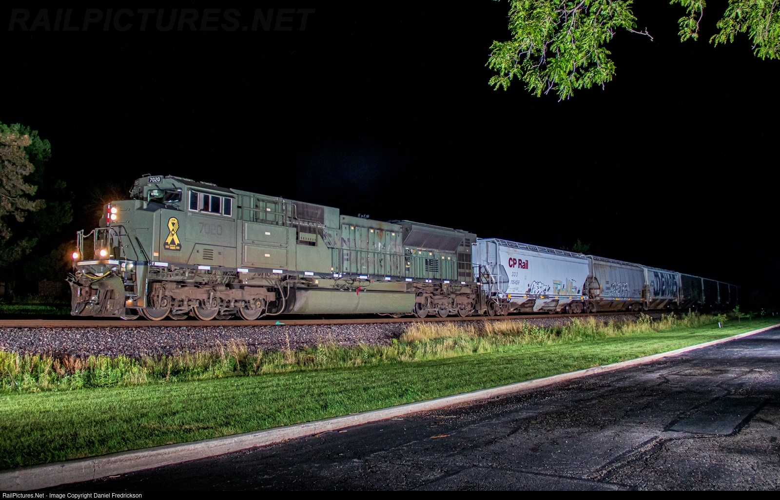 | CP 7020, one of CPKC's military tribute SD70ACUs - this one wearing an Army green "temperate" scheme - trundles through Des Plaines, IL leading CPKC grain train 346. |