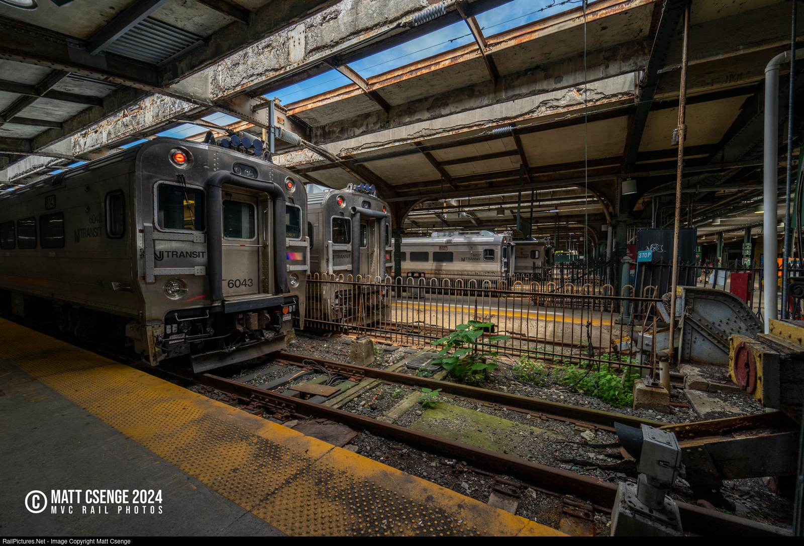 Four NJ Transit Comet V cab cars are seen at the bumper blocks at Hoboken Terminal, their shiny stainless steel contrasting somewhat with the gritty nature of the trainshed. |