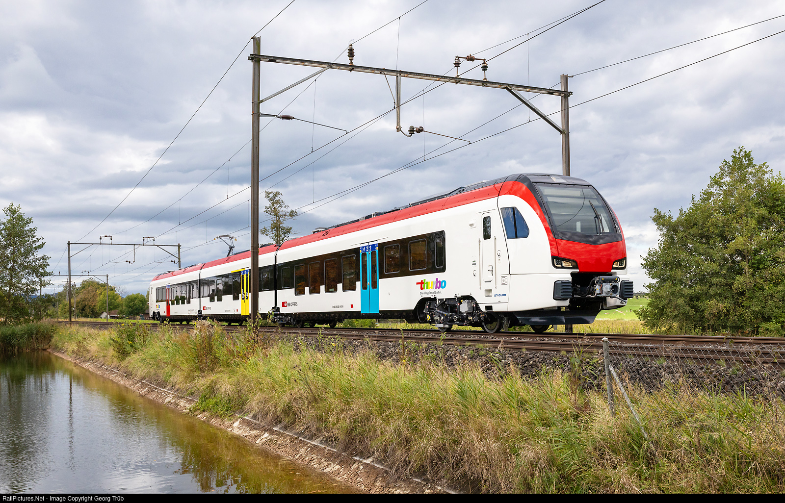 | Brand new "Flirt Evo" RABe 531 # 401 from StadlerRail for the Thurbo, on the test run 97341 from Sulgen to Romanshorn Süd, passing the pond at Riedt near Erlen. This is a version for operation in Switzerland, Germany and Austria, the Thurbo will get 30 of this 3-car version "DACH", RABe 531 # 401 to # 430. |