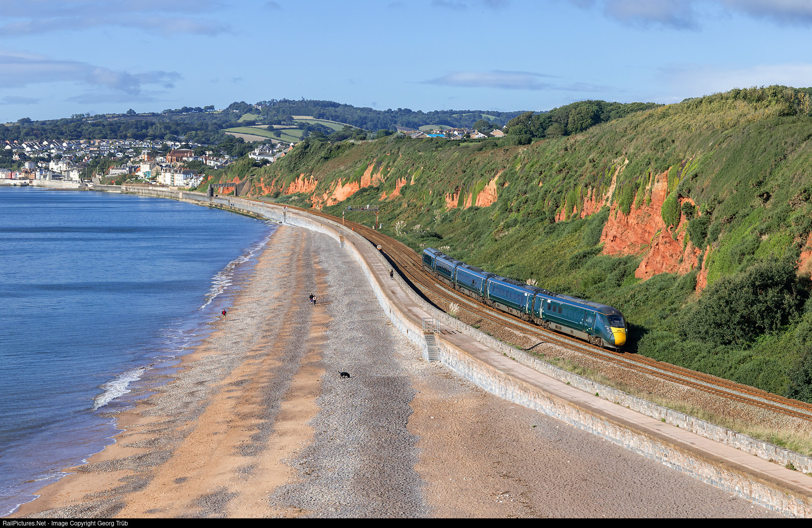 | Hitachi Rail built bi-mode (diesel/electro) highspeed train 800 # 007 of the Great Western Railway (GWR) is rounding the curve at Dawlish Warren, running the 2U10 service from Penzance (0540 AM) to Cardiff Central. |