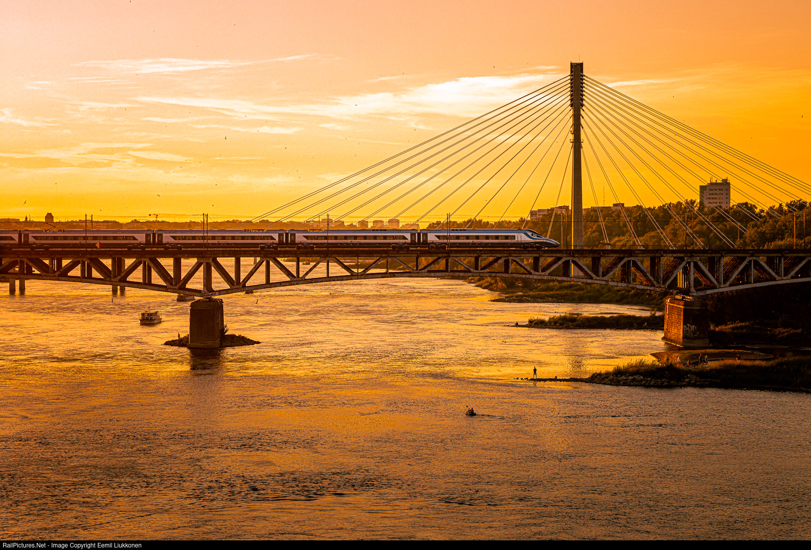 | The nice and beautiful comes to an end, as evening has brought a golden view in the skies of Warsaw. Throughout the whole evening, passanger traffic continues as PKP's Pendolino is crossing the local river and posing against the local scenes. |