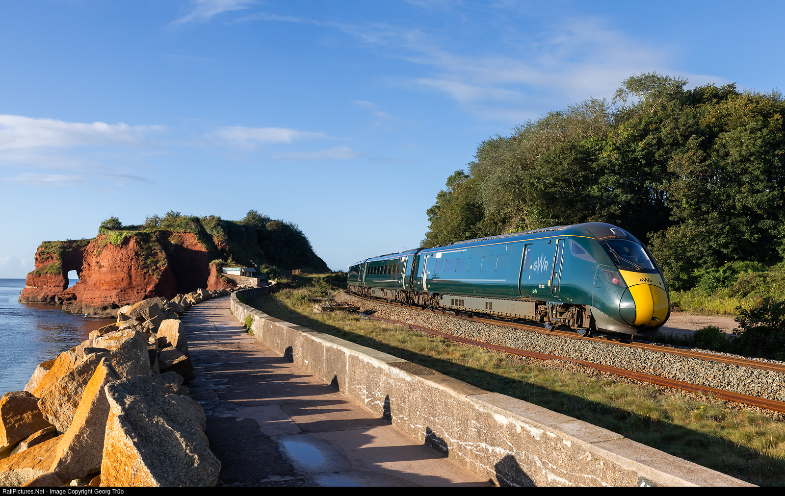 | Hitachi built dual mode (diesel/electro) highspeed train 802 # 022 of the Great Western Railway (GWR) is rounding the curve at Dawlish Warren with 70 mph, running the 2C09 service from Bristol Temple Meads to Penzance. On the left is Langstone Rock, a beautiful photo spot. |