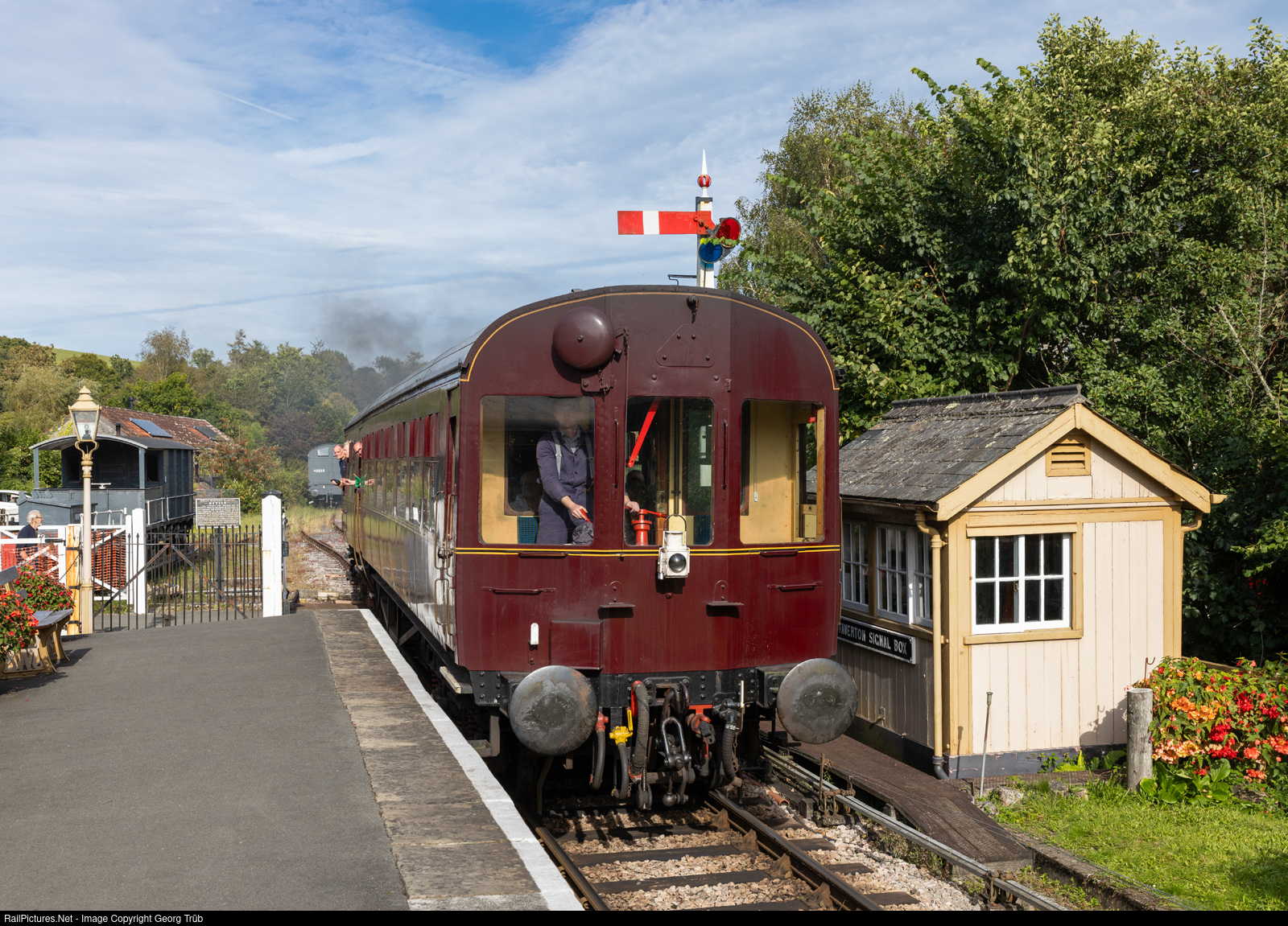 This is a steam powered push-pull train, in Great Britain called "autotrain", with former British Rail cab car # 233 "Kingfisher" leading, and 0-6-0 PT tank steamlocomotive # 6412 (not visible) shoving in the rear, entering Staverton on the South Devon Railway, during the heritage open days. The car was renovated till last year and is in a nice marron paint now. In the "autocoach" service a locomotive fitted with additional control equipment is used to power the autotrain. When running 'autocoach first', the regulator is operated by a linkage to a rotating shaft running the length of the locomotive, passing below the cab floor. This engages (via a telescopic coupling) with another shaft running the full length below the floor of the autocoach. This shaft is turned by a second regulator lever in the cab of the autocoach. The driver can operate the regulator, brakes and whistle from the cab at the end of the autocoach; the fireman remains on the locomotive and (in addition to firing) also controls the valve gear settings. The driver can also warn of the train's approach using a large mechanical gong, prominently mounted high on the cab end of the autocoach, which is operated by stamping on a pedal on the floor of the cab. The driver, guard and fireman communicate with each other by an electric bell system. On the right is the Staverton signal box, which controls the manualy operated gates of the road crossing also.