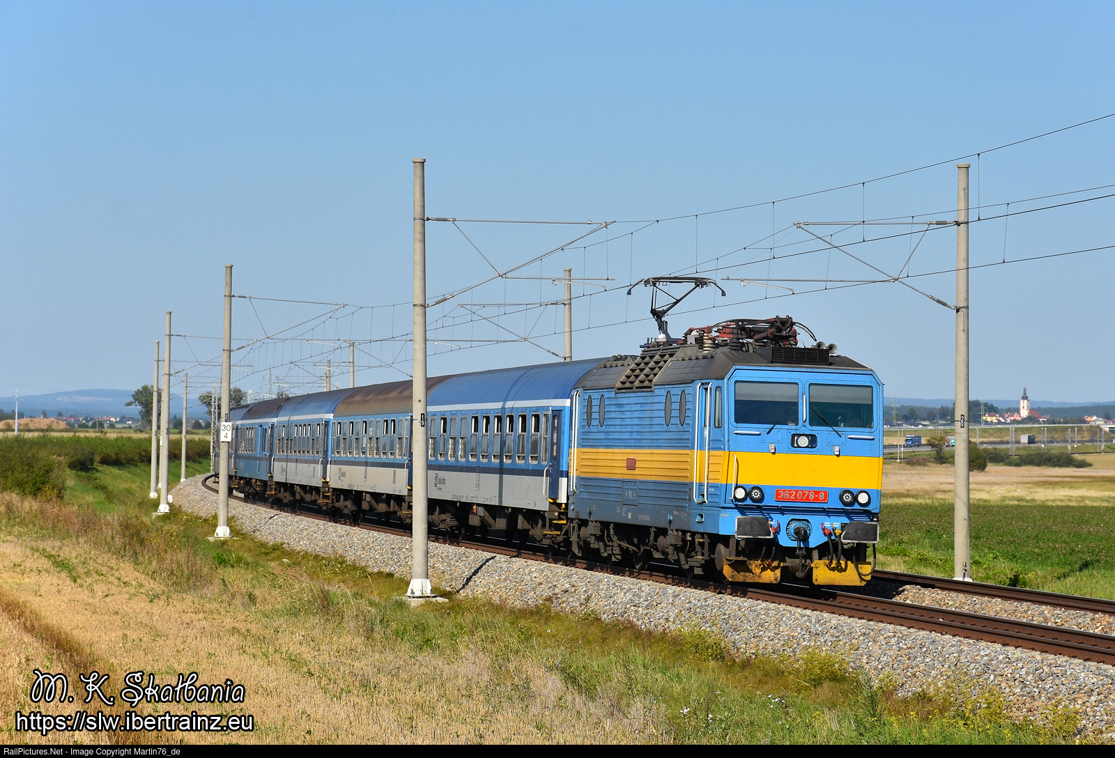 The electric locomotive 362.078-8 hauling a passenger train R 721 "Vltava" from Praha-Holesovice to Ceske Budejovice.