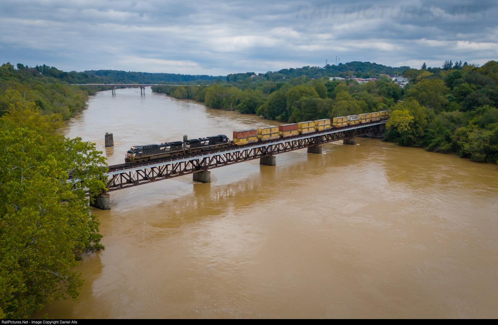Westbound intermodal NS 289 crosses a very angry New River in Radford, VA.