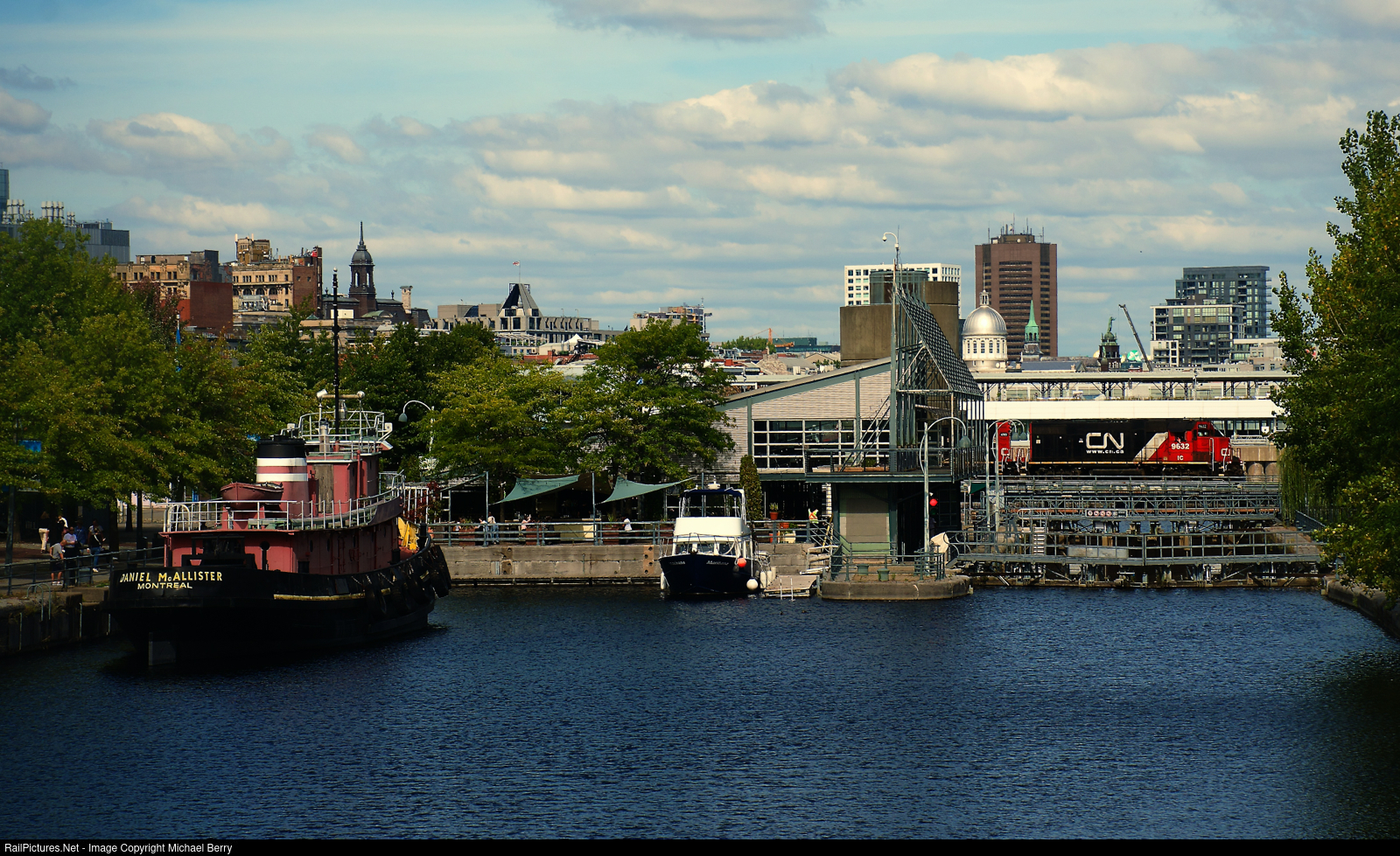 A preserved tugboat is at left as CN 500 leaves the Port of Montreal.