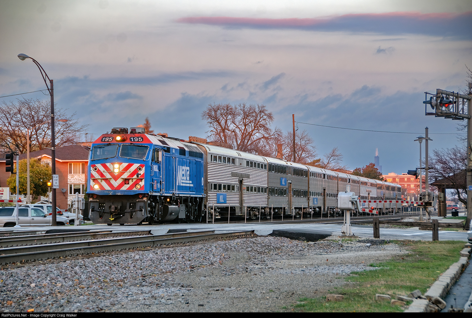 Chicago Metra commuter train 1245 makes its stop at the carrier's Harlem Avenue Station as the sun sets. METX F40PHM-2 195 is pulling seven gallery cars from downtown Chicago (visible by the Willis Tower in the distance) to the western suburb of Downers Grove (or, as it is listed on a Metra website's page: Downers Groove!). Chicago's Regional Transportation Authority's Metra (short for or Metropolitan Rail) is the second-largest and second-busiest commuter rail operation in the United States, second only to New York City's Metropolitan Transit Authority. (Berwyn, Illinois – November 12, 2015)