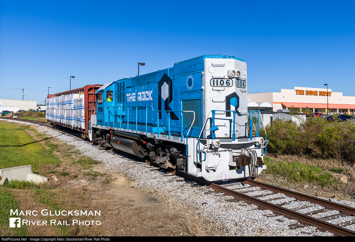 The Rebirth Of the G&SI. On the morning of September 29, 2022, Rock Island Rail GP15-1 RILX 1106 (née-CNW 4411, EMD, 6/1976) headed out to the interchange with Kansas City Southern Railroad to pick up a lumber car for Interior Exterior Building Supply. The reactivation of the former Gulf & Ship Island Railroad (later Illinois Central Railroad) brings great promise to the area for more than just single car movement to supply the industries in the Harrison County Development Commission/Gulfport, Mississippi area. The line had been dormant for several years before Rock Island Rail met with county officials and developed a plan to repair the track. That day, the single car would be unloaded while the crew waited and returned to KCS to keep the demurrage charges as low as possible, but Rock Island Rail had also developed relationships with several companies in the area that now receive shipments by rail. The "G&SIRR" logo on the rear of the unit honors the line's heritage. The short train is seen passing Home Depot on the way to its destination.