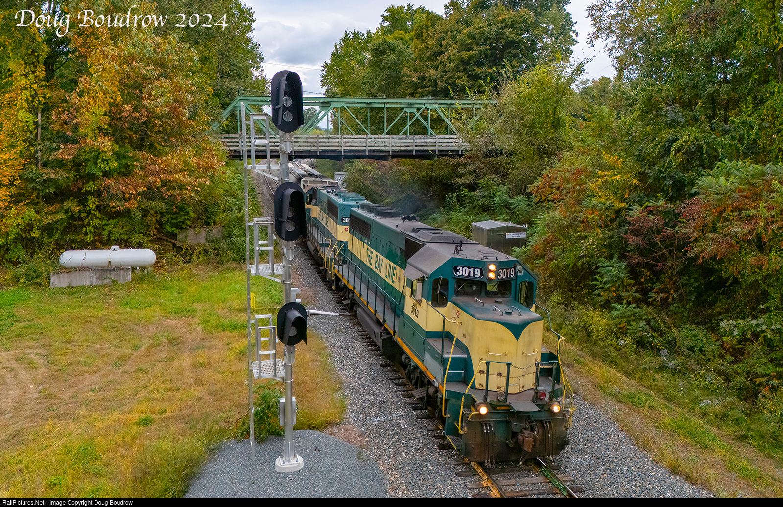 | Berkshire & Eastern East Deerfield, MA to Bellows Falls, VT freight EDBF is seen heading North through East Northfield on the former Boston & Maine Connecticut River Line. The green and gold locomotives were moved to the Berkshire & Eastern from the Bay Line in Florida and Alabama in 2023. |