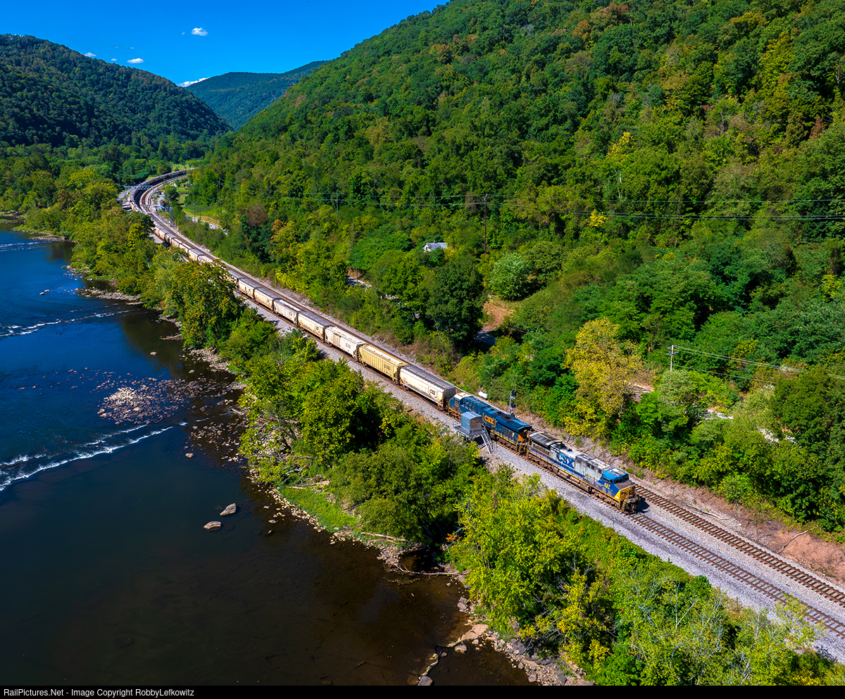 Grain Groove: CSXT 427, sporting YN2 colors, leads loaded grain train CSX G621 eastbound through Meadow Creek, West Virginia, along the CSX New River Subdivision.