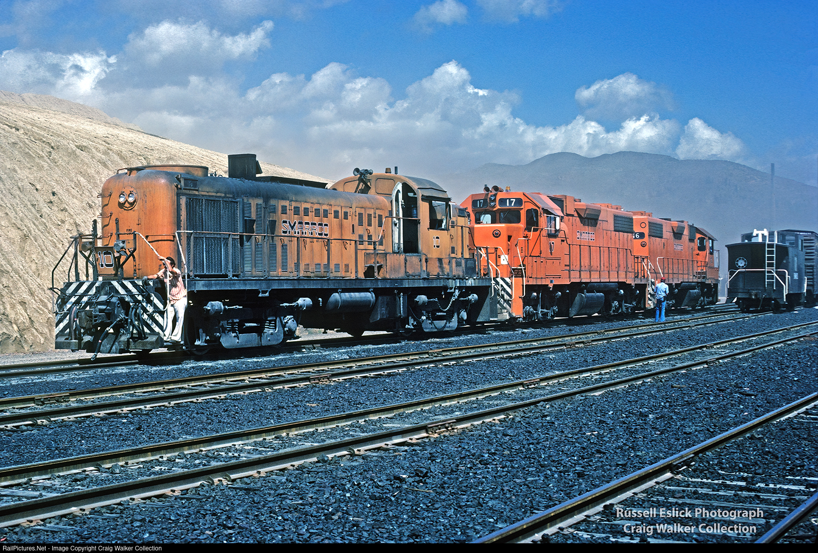 Back in batter days, SMA RS-3 10 (originally Reading Company 521) and GP38-2s 17 and 16 (built by EMD in October 1971) are seen dropping a train off for the CBRY. (Hayden, Arizona – September 27, 1982) Russell Eslick photograph, Craig Walker collection