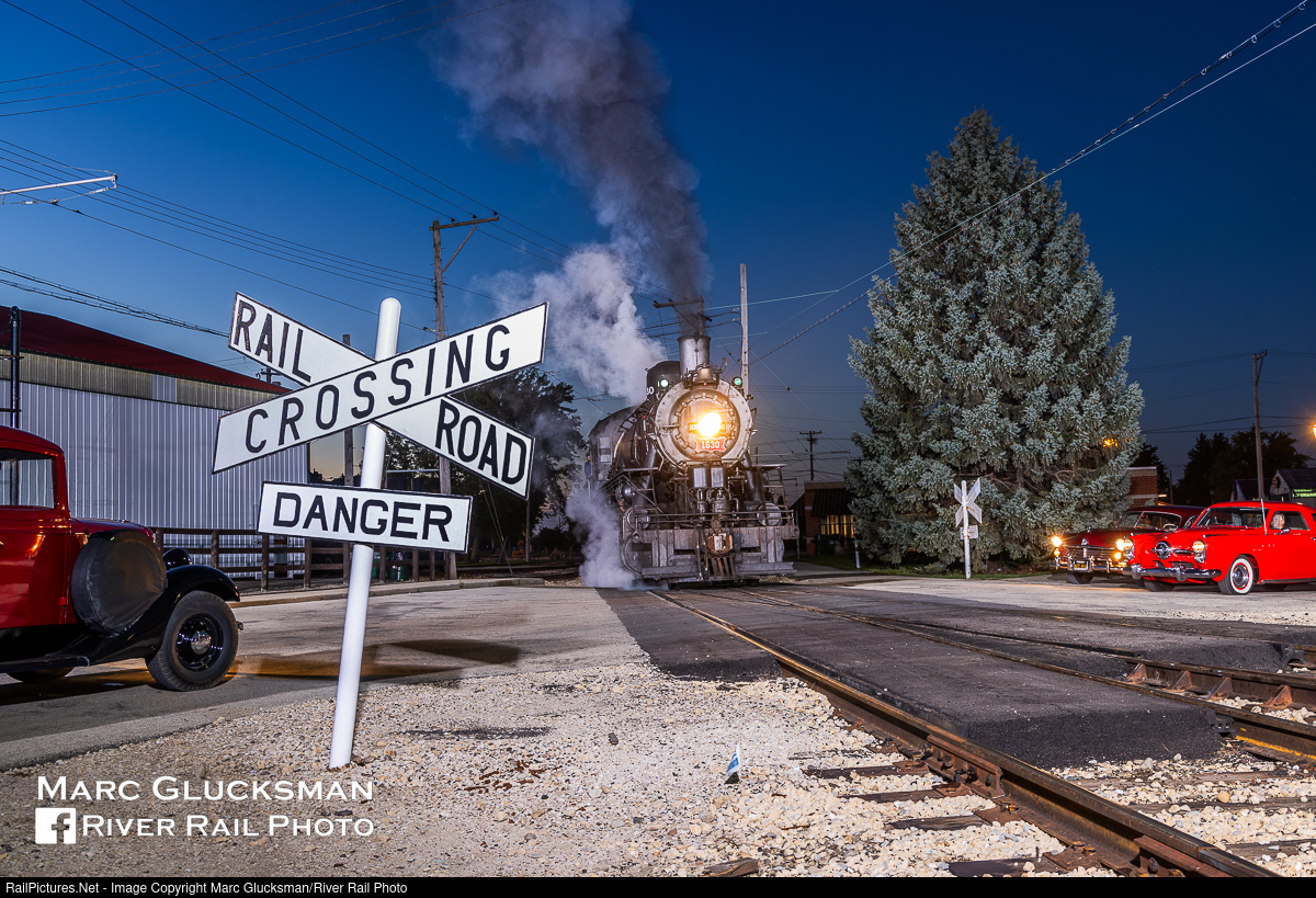 Blue Hour Crowded Crossing. On the evening of Saturday, October 1, 2022 at the marked crossing at Springfield Avenue at the Illinois Railway Museum in Union, Illinois, a number of vintage automobiles were arranged up as part of a night photo event. The shoot featured former St. Louis-San Francisco Railway "Frisco" 1918 Baldwin Locomotive Works 1630 (2-10-0). This is one of 2 operating "decapods" in the United States (the other being former Great Western No. 90 at the Strasburg Rail Road) and is an active member of the IRM steam fleet.