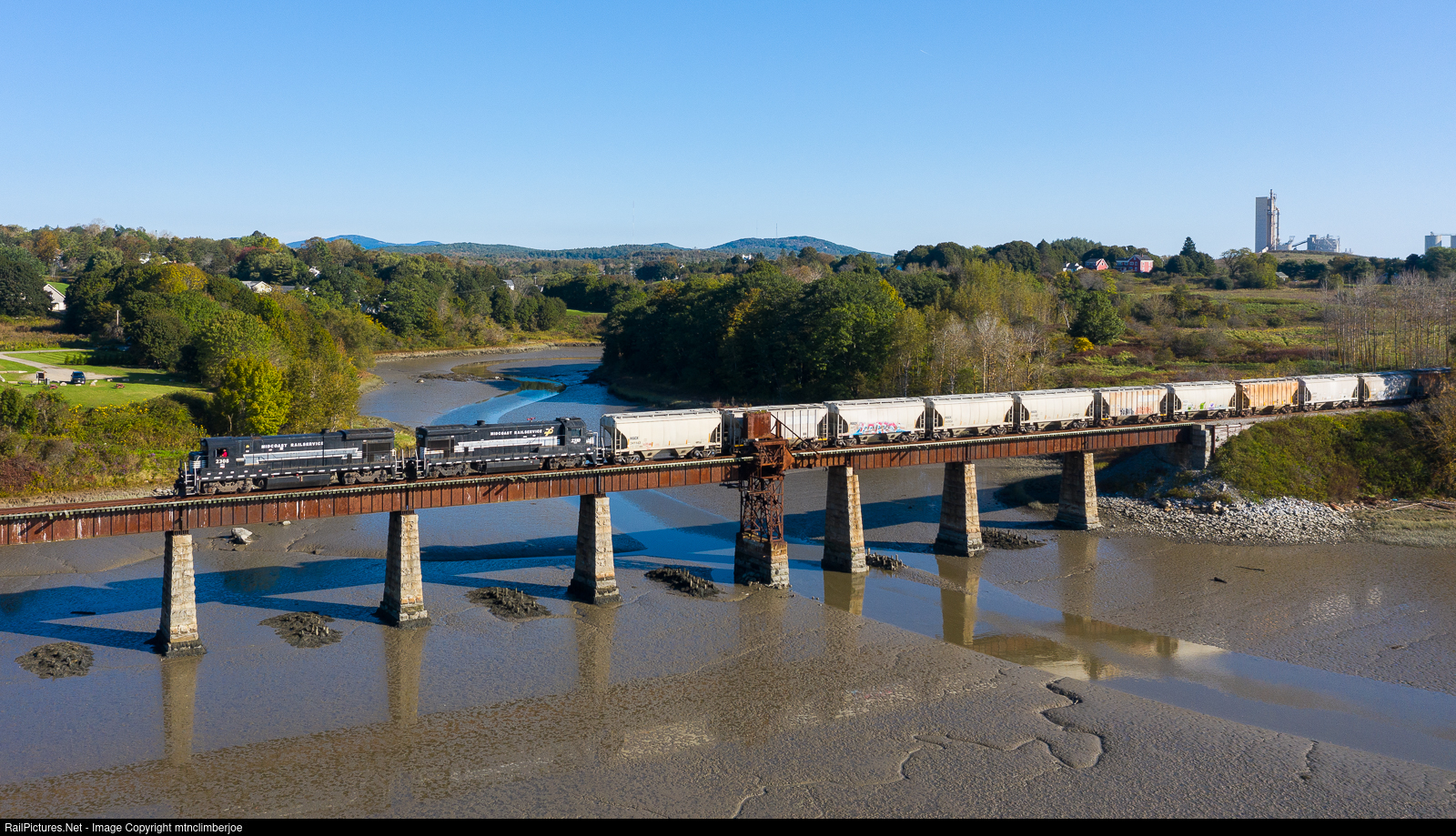 | With a train of cars picked up from Dragon Cement and Dicaperl Minerals, a pair of B23-7's lead the Midcoast Rail's westbound train as it begins its trip to Brunswick. As the train approaches the town of Thomaston, Maine it crosses over the bridge spanning the outflow of the Mill River where it empties into the Saint George River estuary.