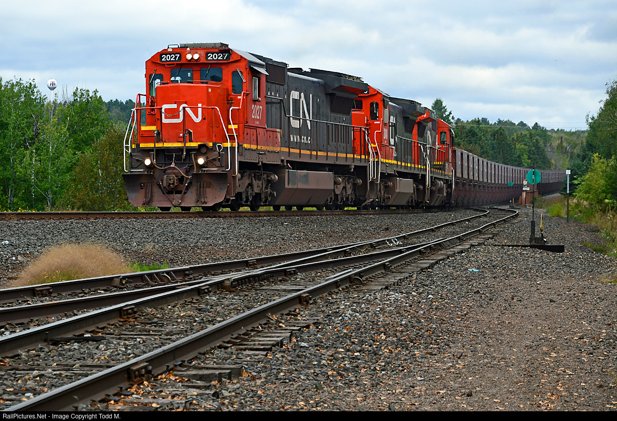 | Coming to the end of their journey from the Minorca mine with 145 carloads of iron ore pellets, CN 2027 knocks down the signal entering the yard at Two Harbors, MN. |