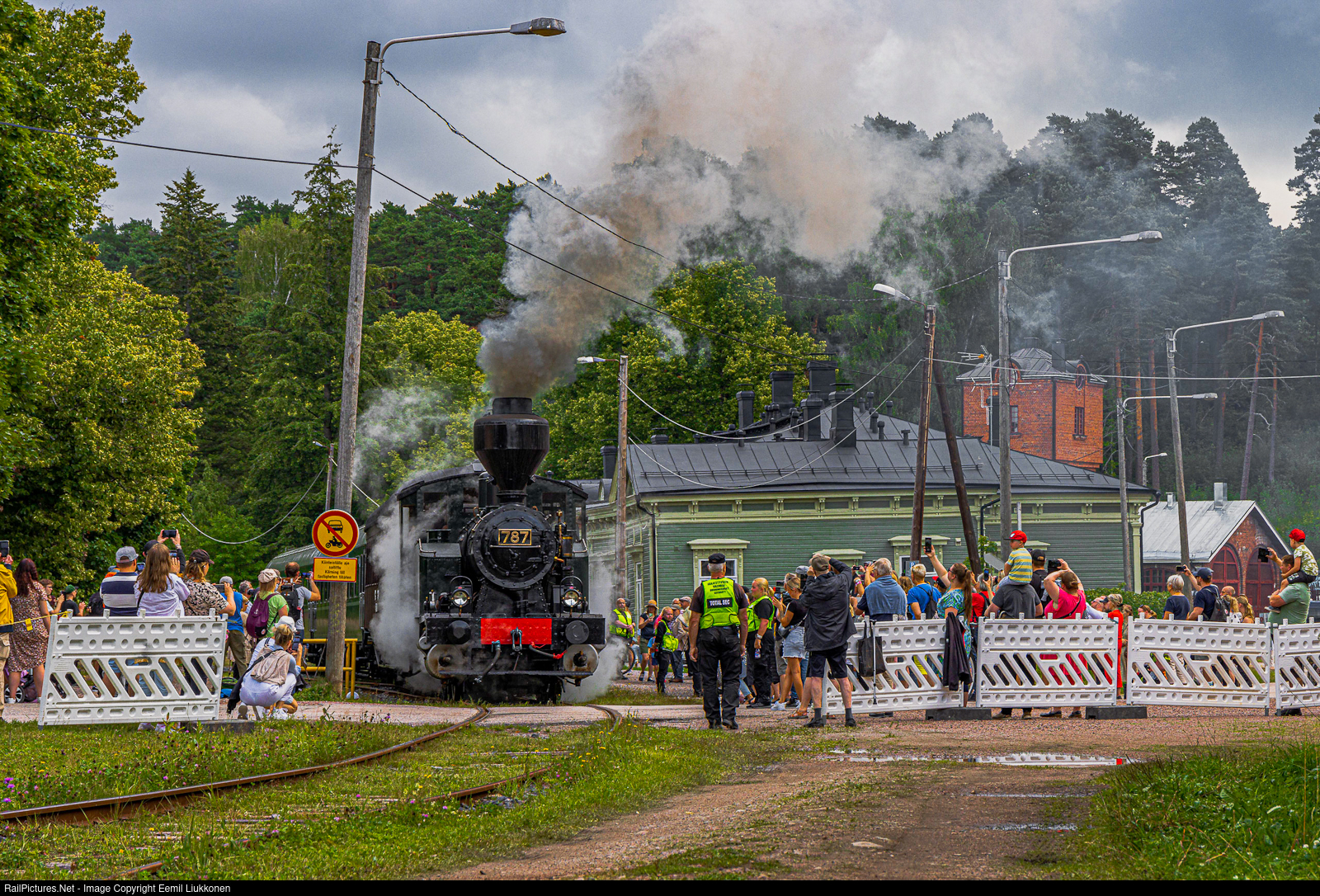 | A class Vr1 steam locomotive number 787 is departing from Porvoo Station as it starts a journey to Hinthaara. People who have come to celebrate the 150th anniversary of the local railroad are watching excitingly as the small tank engine puffs into motion. |