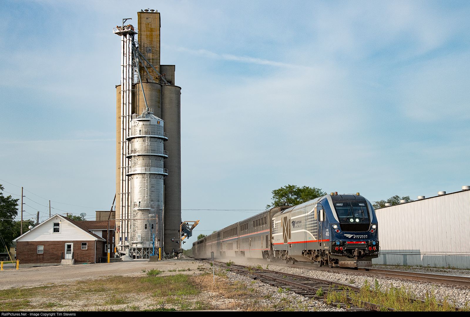 Amtrak 393, the southbound "Illini" races through the small town of Ludlow kicking up some dust at full track speed.