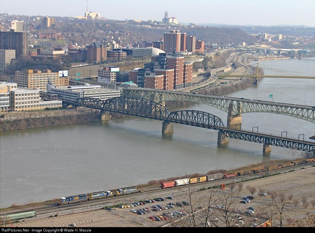 | 389 rolls west on the Pittsburgh Sub at Station Square. The building to the left of the Panhandle Bridge belongs to PNC Bank, and is built on the site of the former B&O Grant St. station. |