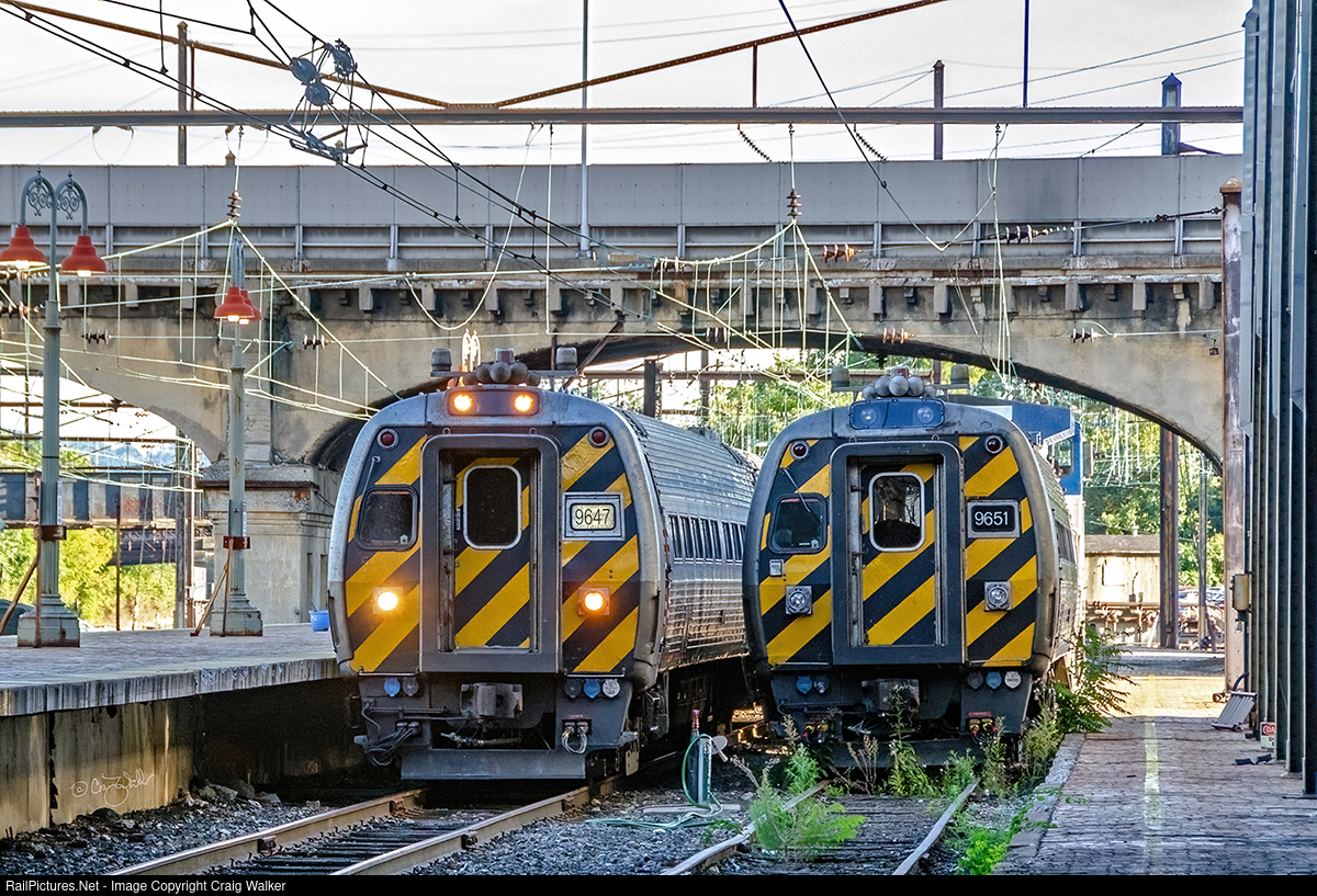 Amtrak train 647, a Keystone Service train from New York NY, arrives at its final destination of Harrisburg. on September 25th, 2013. Cab car 9647 (rebuilt from 1967-built Amtrak Metroliner 801, originally Penn Central 801) is on the point, and has just passed another cab car (9651) on an adjacent track. (Harrisburg, Pennsylvania – September 25, 2013)