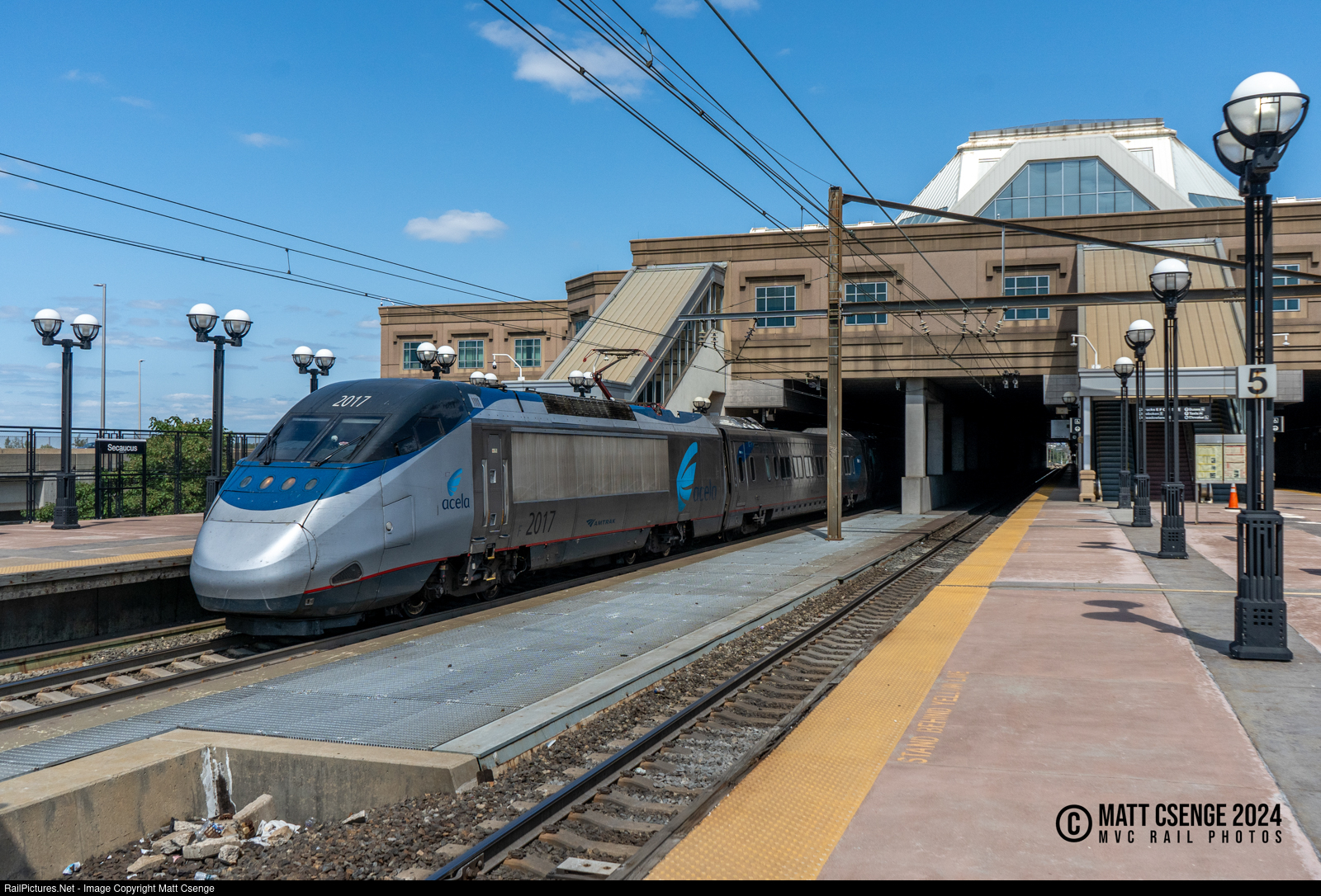 Amtrak Acela train 2121 is seen blasting through Secaucus Junction Station with power car 2017 in the lead.