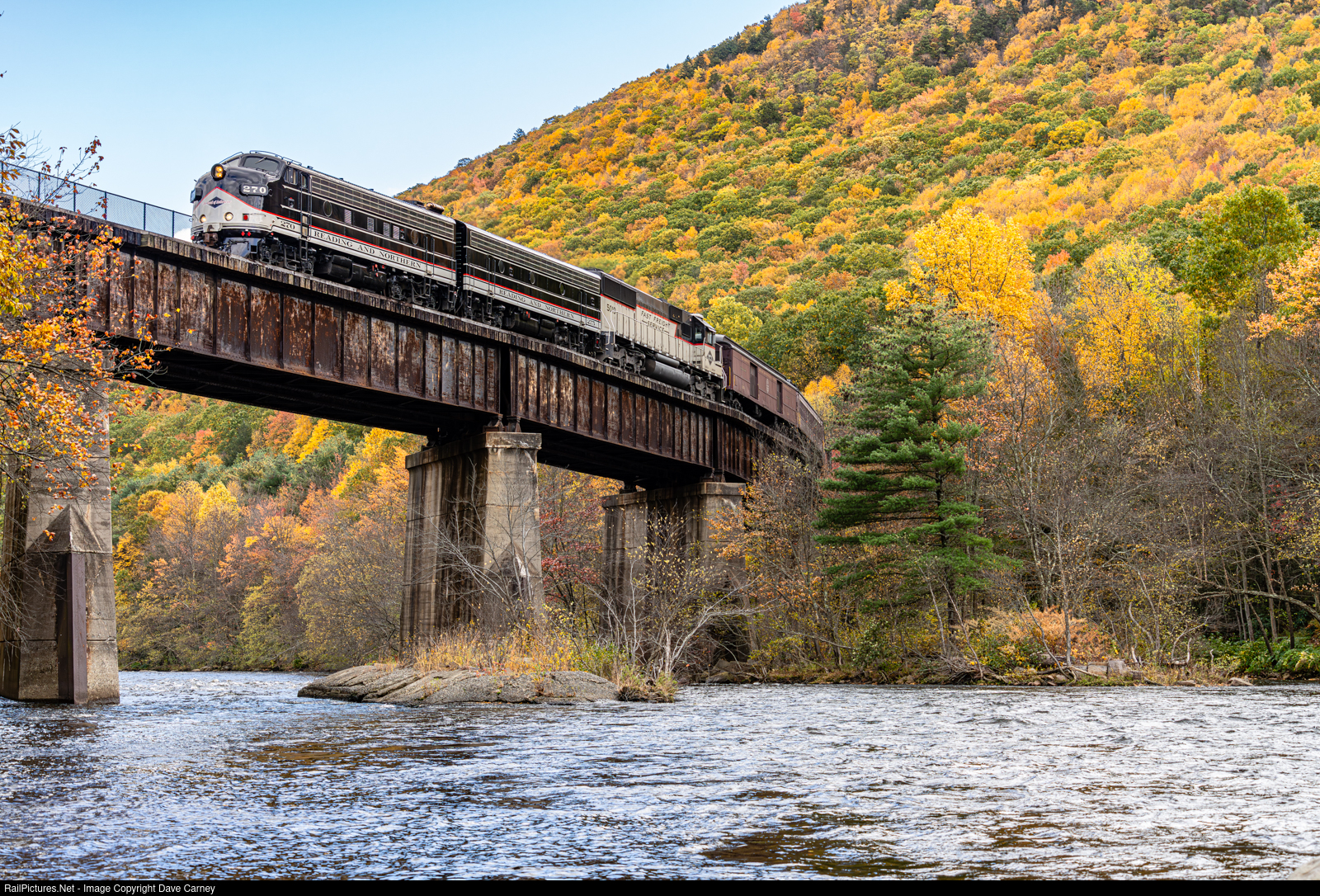 The OSJT is seen crossing the Lehigh River during peak fall colors. It is making its reverse move back to Jim Thorpe.