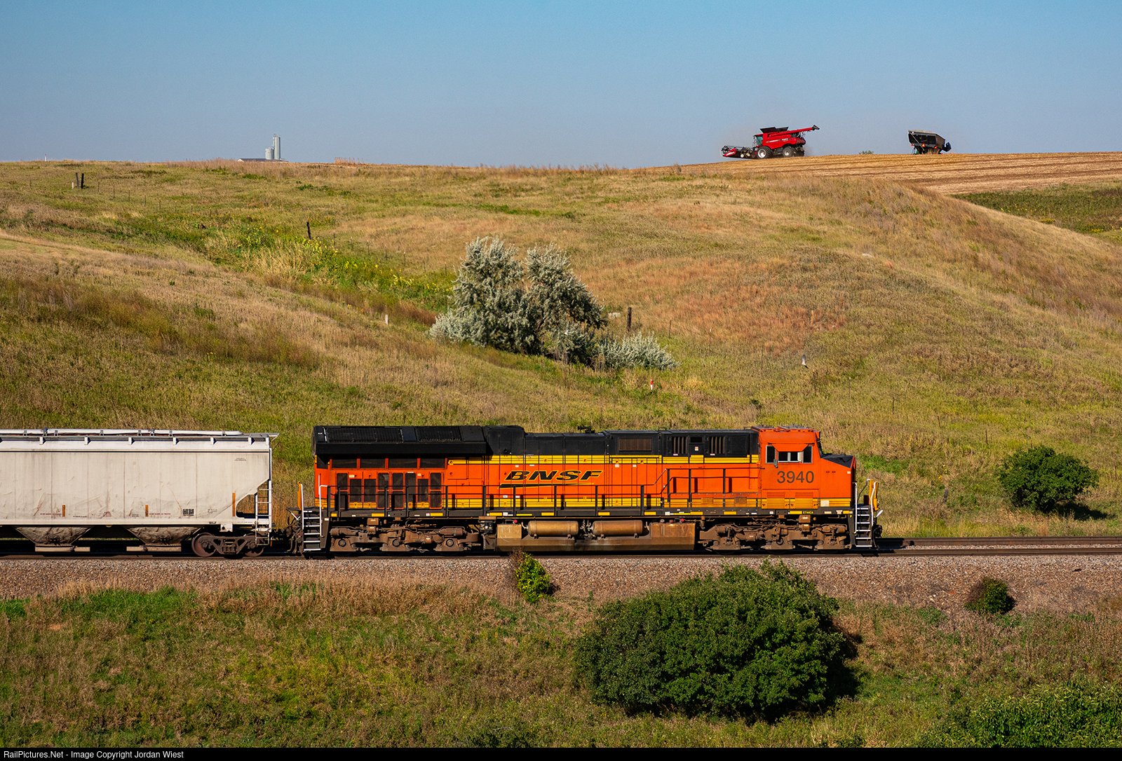 BNSF 3940 pushes a grain train west, while a field is being harvested above. Perhaps the crops will end up on trains such as this one.
