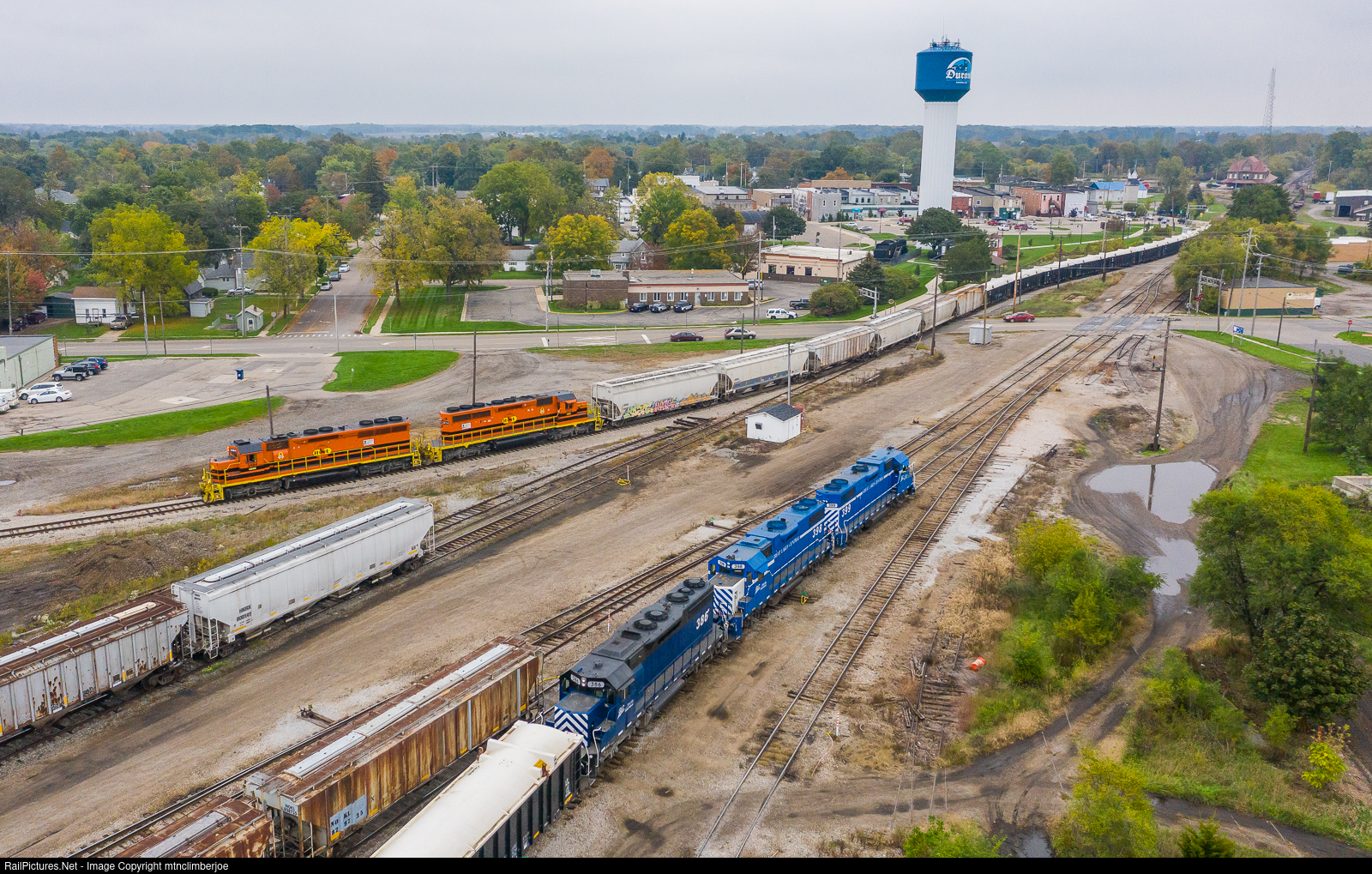 | With their work completed in Durand, Michigan the Huron & Eastern Railroad's train 701 departs town up the Saginaw Subdivision. Meanwhile, the Great Lake Central's OSTN has arrived at the yard and will work here before proceeding south. |
