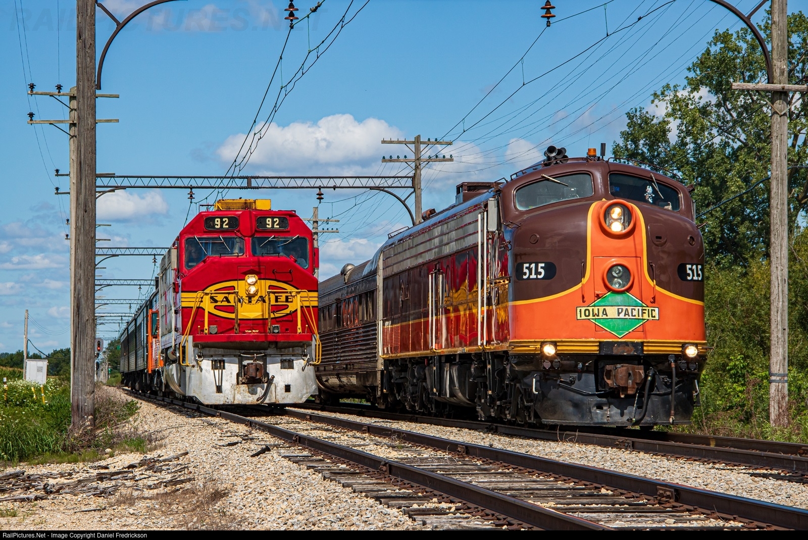 | It's the Illinois Railway Museum's annual Diesel Days event, and on this Sunday the mainline trains were running primarily with cab units. Here, SLRG 515 waits in Johnson siding with the Nebraska Zephyr while ATSF 92 comes up alongside with the coach train. |