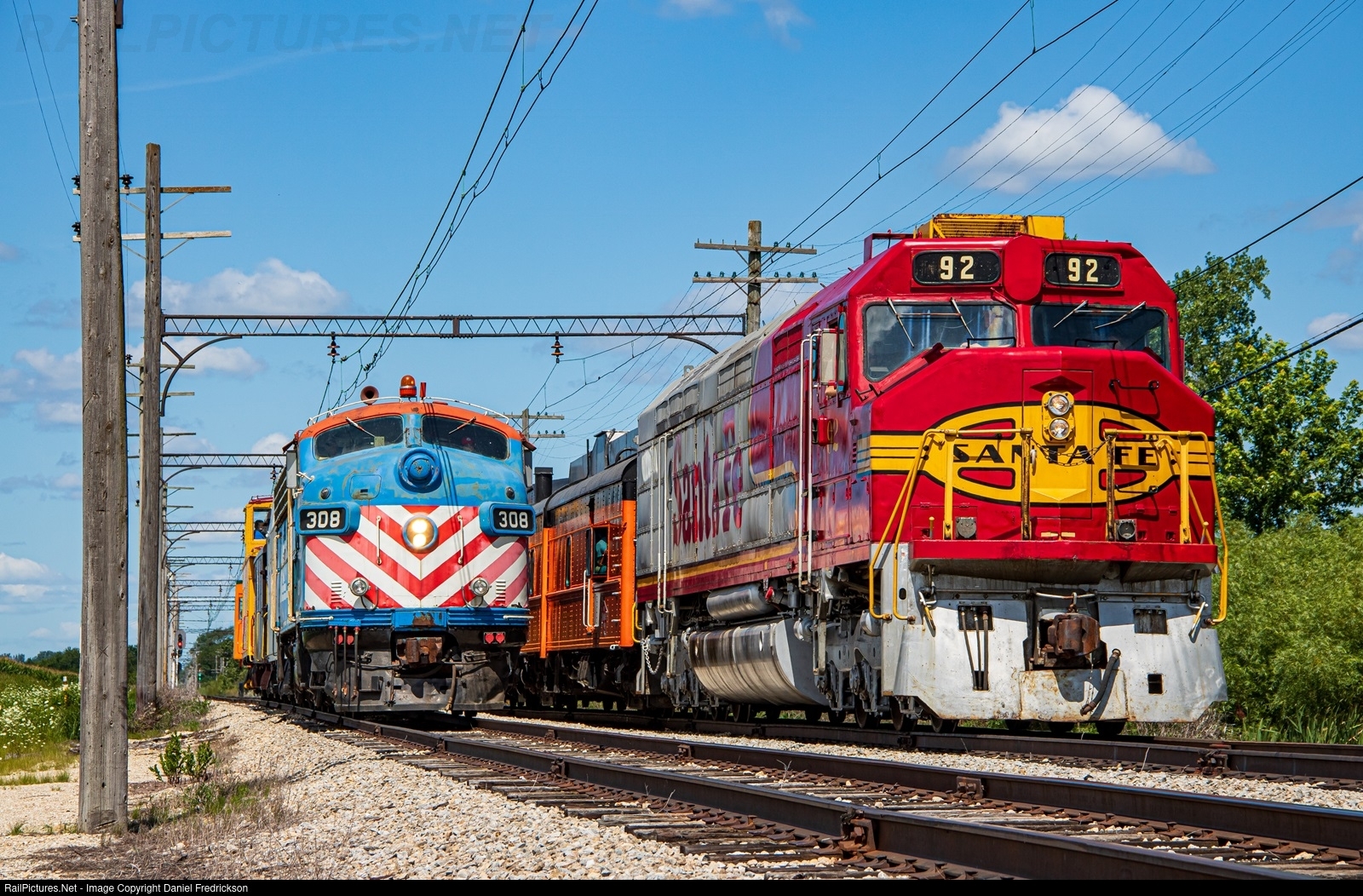 | It's the Illinois Railway Museum's annual Diesel Days event, and on this Sunday the mainline trains were running primarily with cab units. Here, ATSF 92 waits in Johnson siding with the coach train while METX 308 comes up alongside with the caboose train. |