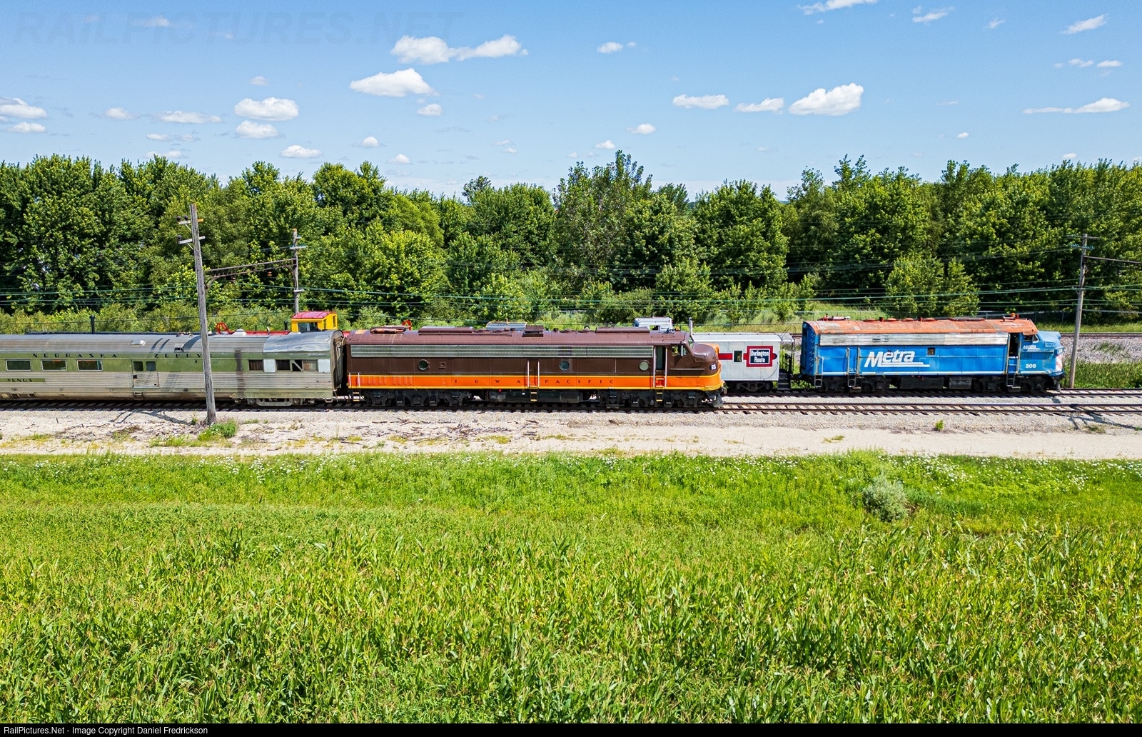 | It's the Illinois Railway Museum's annual Diesel Days event, and on this Sunday the mainline trains were running primarily with cab units. Here, METX 308 waits in Johnson siding with the caboose train while SLRG 515 comes alongside with the Nebraska Zephyr. |