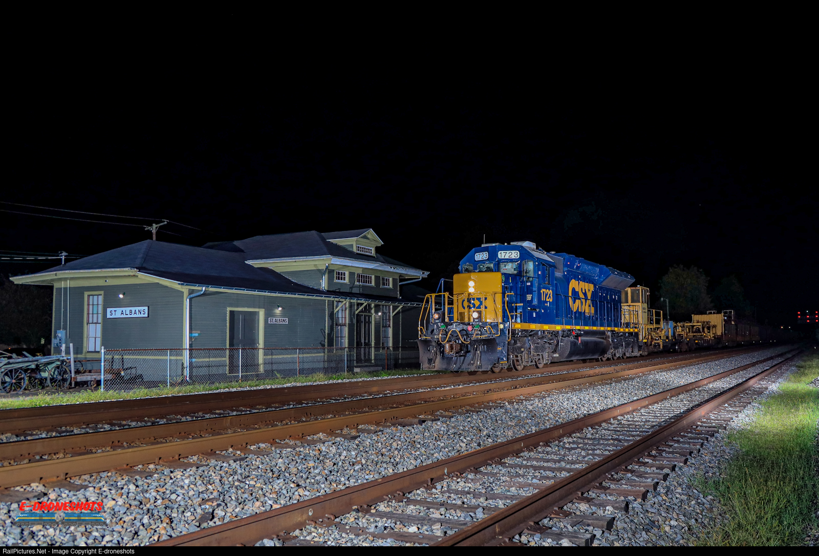 Pulling a loaded rail train, CSX 1723 creeps by the Saint Albans Depot.
