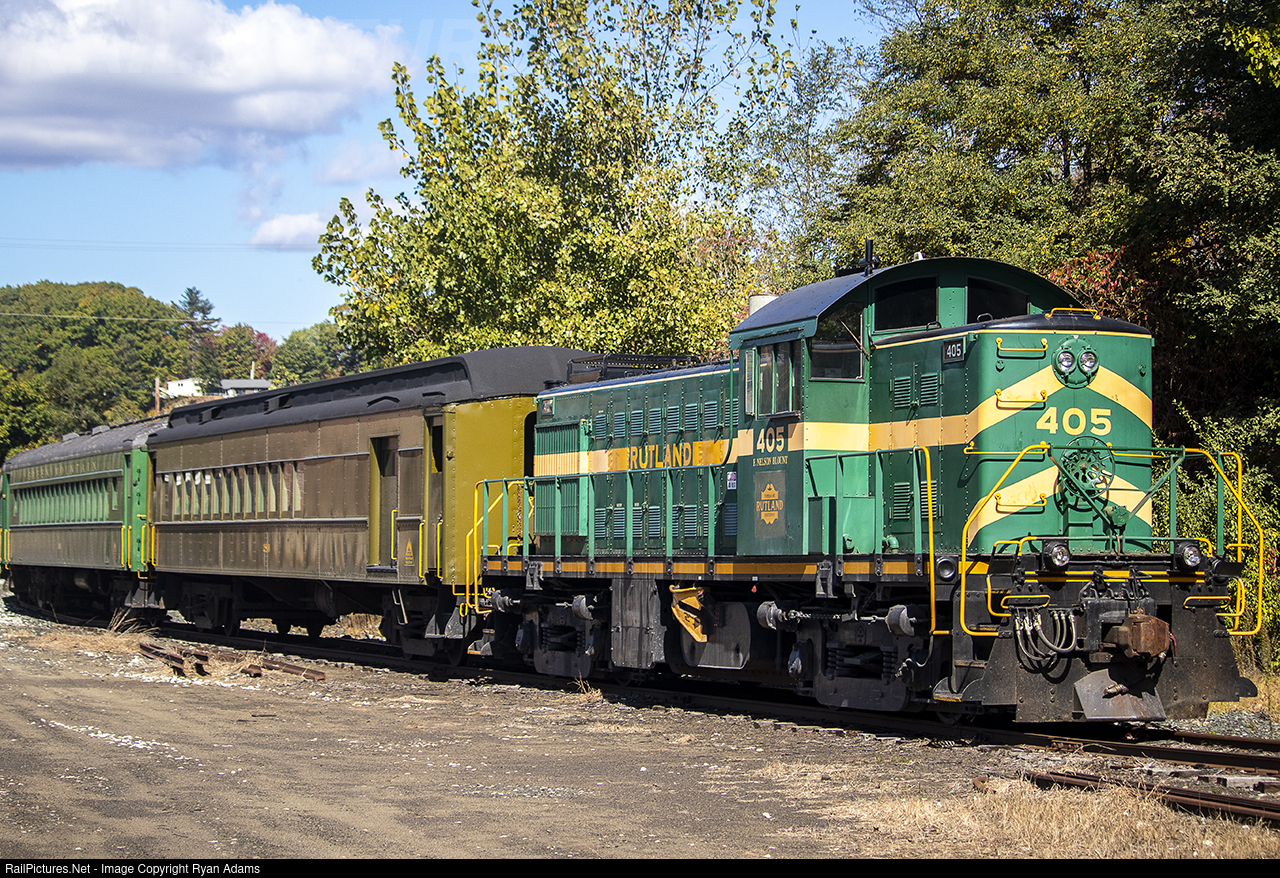 | The Green Mountain Railroad 405 is still masquerading as its original owner after a quick day's of work along the Connecticut River line chasing the Dartmouth College Women Rowing team up and down the river. The GMRC 405 was "repainted" into the Rutland 405 for a recent Trains' magazine charter and the shop crews decided to keep it around a little longer. |