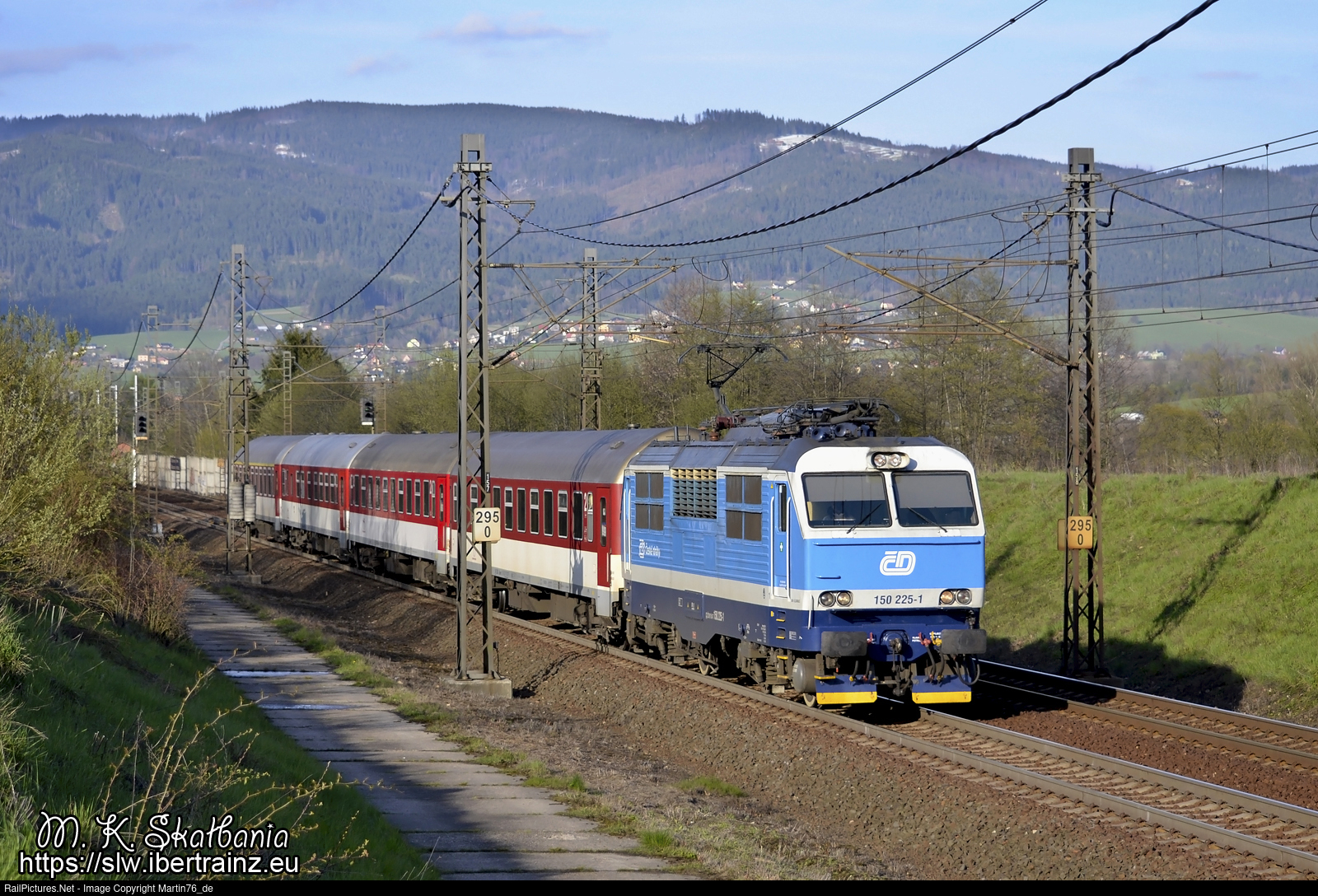 The electric locomotive 150.225-1 hauling a passenger train from Ostrava-Svinov to Zilina.