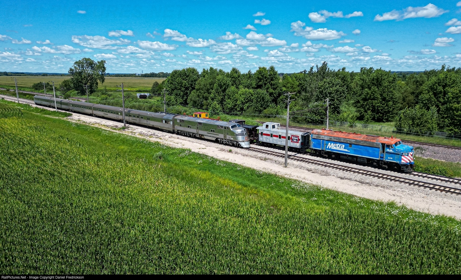 | It's the Illinois Railway Museum's annual Diesel Days event, and on this Sunday the mainline trains were running primarily with cab units. Here, METX 308 waits in Johnson siding with the caboose train while the Nebraska Zephyr - this time with CBQ 9911A on point - passes by. |