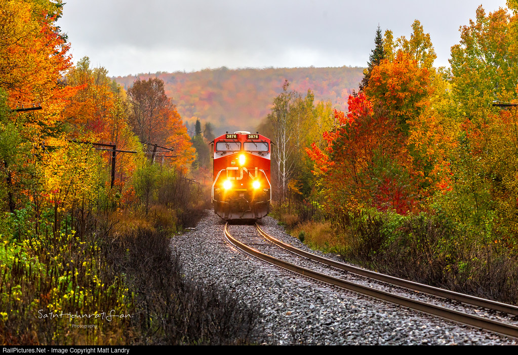 | Getting up to speed after the meet, CN 306 passes some amazing fall foliage as they continue eastward, approaching Glendyne and St Marc Du Lac Long. |