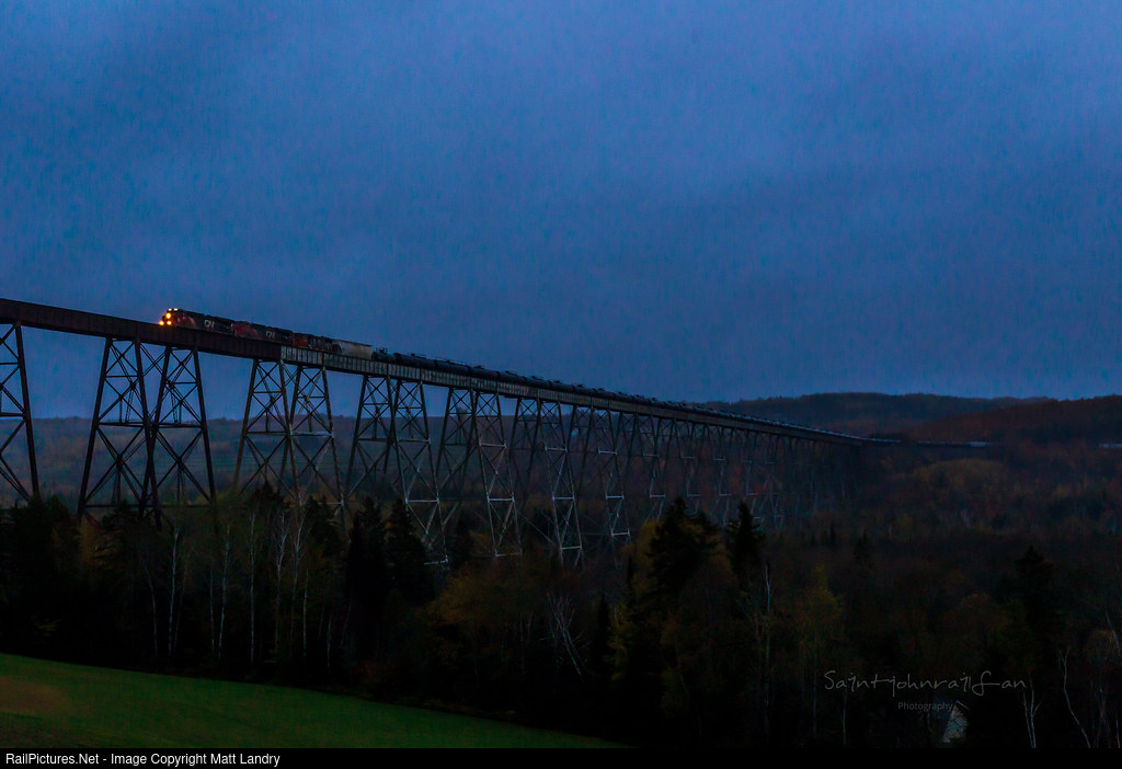 Trackwork along the Napadogan Sub pushed back the order time for train 305 out of Moncton. With very little light left, train 305 makes it's way along the 3,920 foot Salmon River Trestle, where it will meet train 306 on the other side.