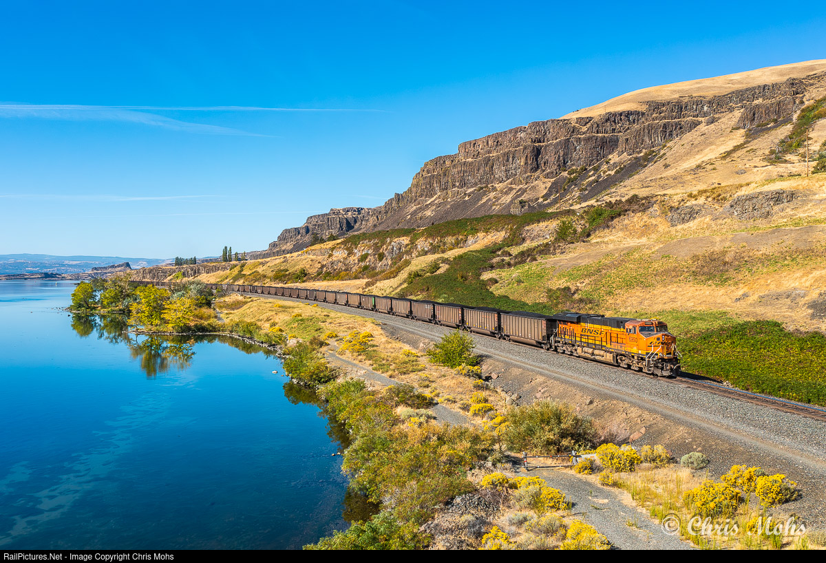 | Bound for shipment to oversea ports, ES44C4 no.6950 pushes on the rear of a Westbound Coal Train. BNSF moves quite a few Coal trains along the Fallbridge Subdivision. |