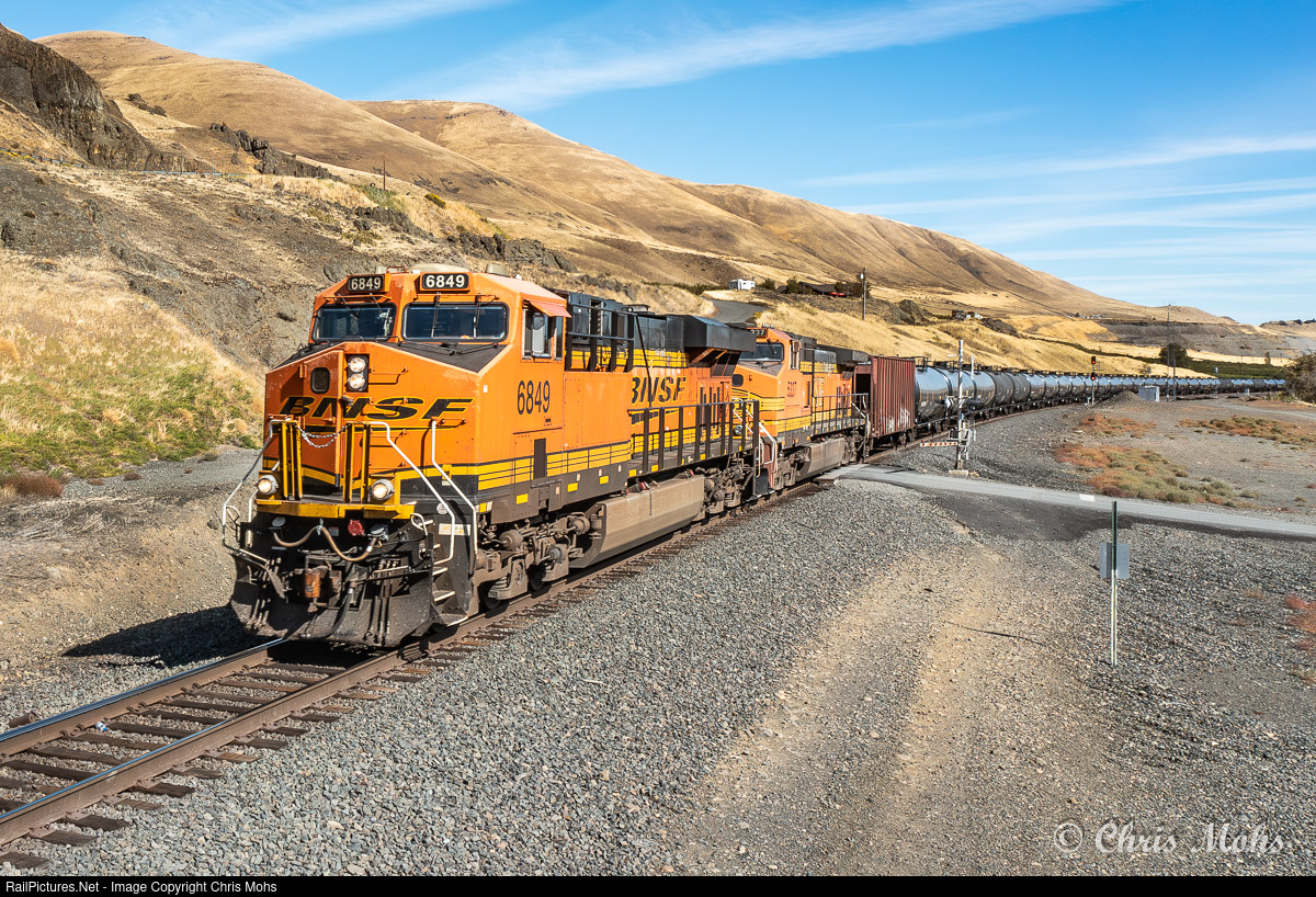 BNSF ES44C4 no. 6849 leads a long string of Crude Oil Tanks through Avery Park on the Fallbridge Subdivision.