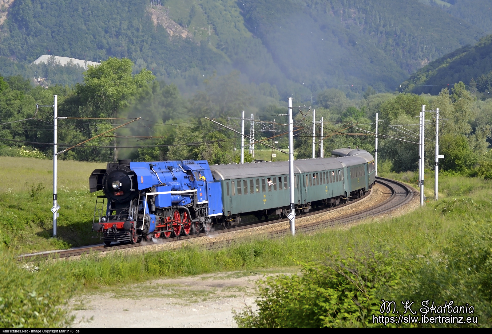The steam locomotive 477.013 hauling a special passenger train from Zilina to Vrutky.