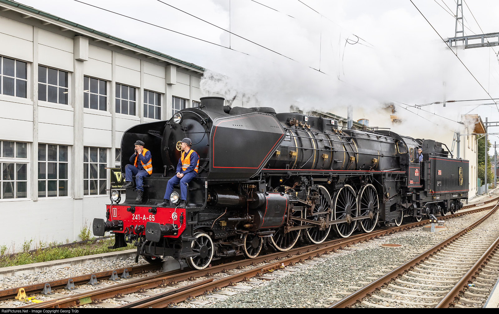 | The former french railway SNCF fourcylinder compound express train steamlocomotive 241 A # 65 of the association Dampflok-Depot Full (DDF) made a visit at the Huttwil steam days in the Emmental. After a journey from Sumiswald-Grünen to Huttwil, the large steamlocomotive is moving in front of the depot for lubrification, water and coal. |